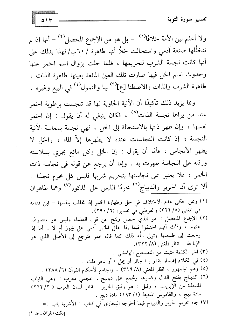 عند من يراها نجسة الذات، فكان ينبغي له أن يقول: إن الخمر نفسها، وإن طهر ذاتها بالاستحالة إنما الخل، فهي نجسة بمماسة الآنية النجسة، إذ كانت النجاسات عنده لا يطهرها إلا الماء، والخل لا يطهر الأنجاس، فأما أن يقول: إن الخل وكل مائع يجري بسلاسته ورقته على النجاسة طهرت به. وإما أن يرجع عن قوله في نجاسة ذات الخمر، فلا يعتبر على نجاستها بتحريم شربها فليس كل محرم نجسا. ألا ترى أن الحرير والديباج محرما اللبس على الذكور وهما طاهران