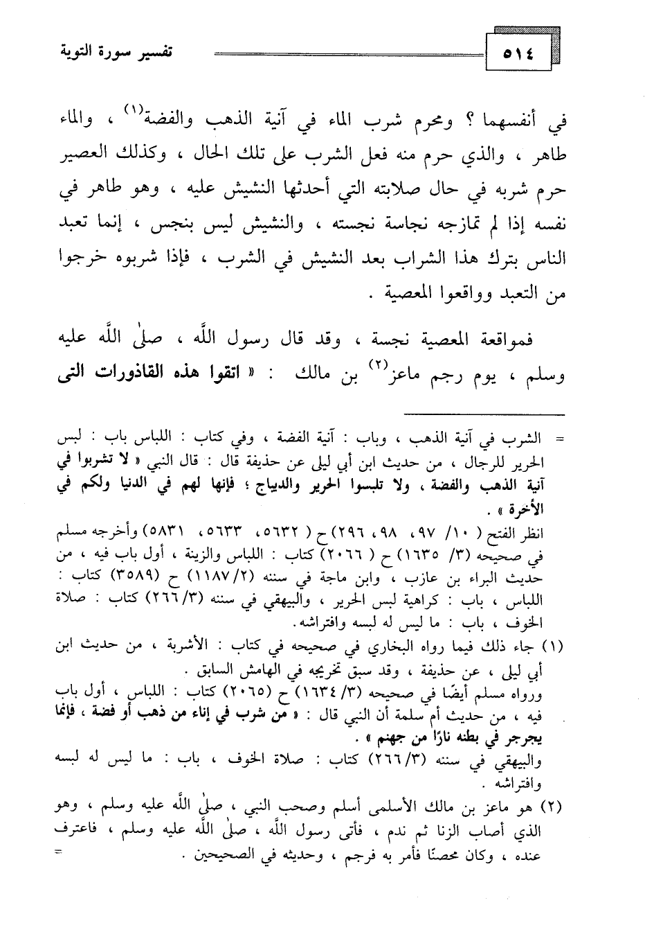 في أنفسهما، ومحرم شرب الماء في آنية الذهب والفضة، والماء طاهر، والذي حرم منه فعل الشرب على تلك الحال، وكذلك العصير حرم شاربه في حال صلابته التي أحدثها النشيش عليه، وهو طاهر في نفسه إذا لم تمازجه نجاسة نجسته، والنشيش ليس بنجس، إنما تعبد الناس بترك هذا الشراب بعد النشيش في الشرب، فإذا شربوه خرجوا من التعبد وواقعوا المعصية.