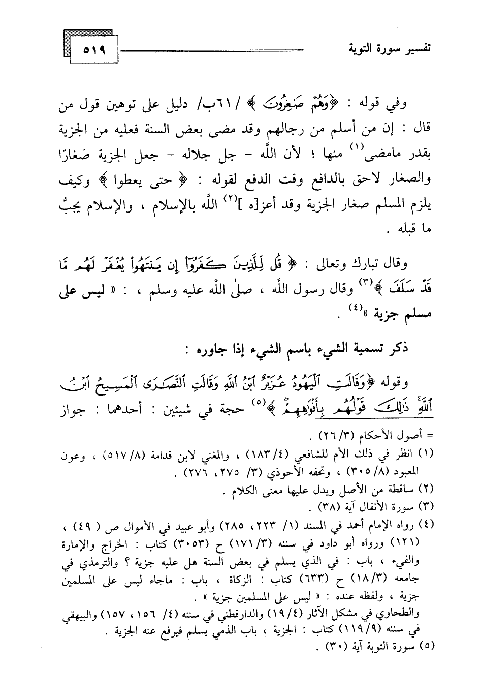 دليل على توهين قول من قال: إن من أسلم من رجالهم وقد مضى بعض السنة فعليه من الجزية بقدر ما مضى منها، لأن الله - جل جلاله - جعل الجزية صغارا والصغار لاحق بالدافع وقت الدفع لقوله: (حَتَّى يُعْطُوا الْجِزْيَةَ) وكيف يلزم المسلم صغار الجزية وقد أعزه الله بالإسلام، والإسلام يجب ما قبله