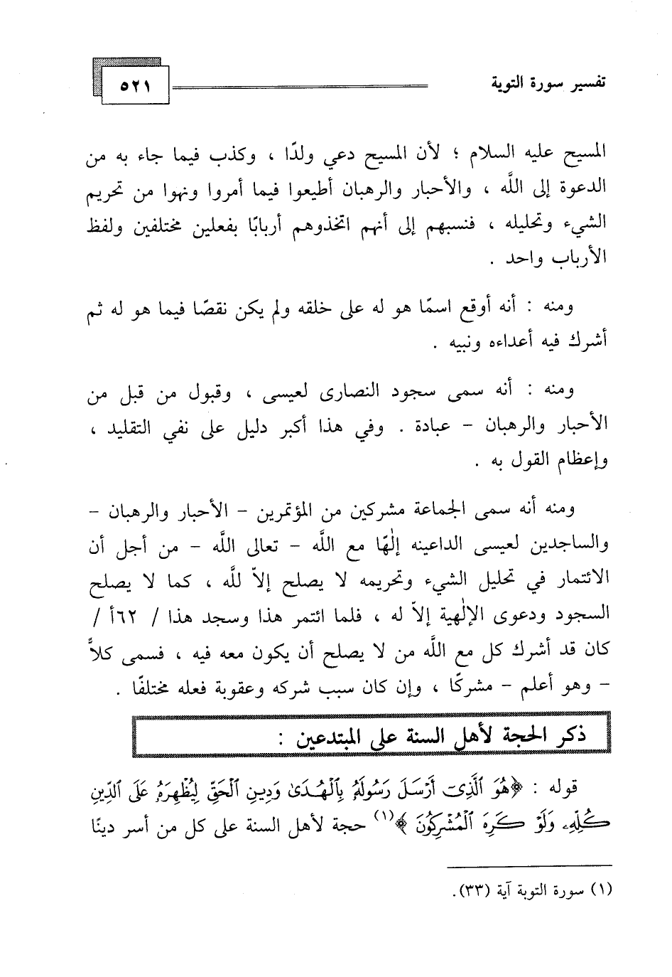 قوله: (هُوَ الَّذِي أَرْسَلَ رَسُولَهُ بِالْهُدَى وَدِينِ الْحَقِّ لِيُظْهِرَهُ عَلَى الدِّينِ كُلِّهِ وَلَوْ كَرِهَ الْمُشْرِكُونَ (33)