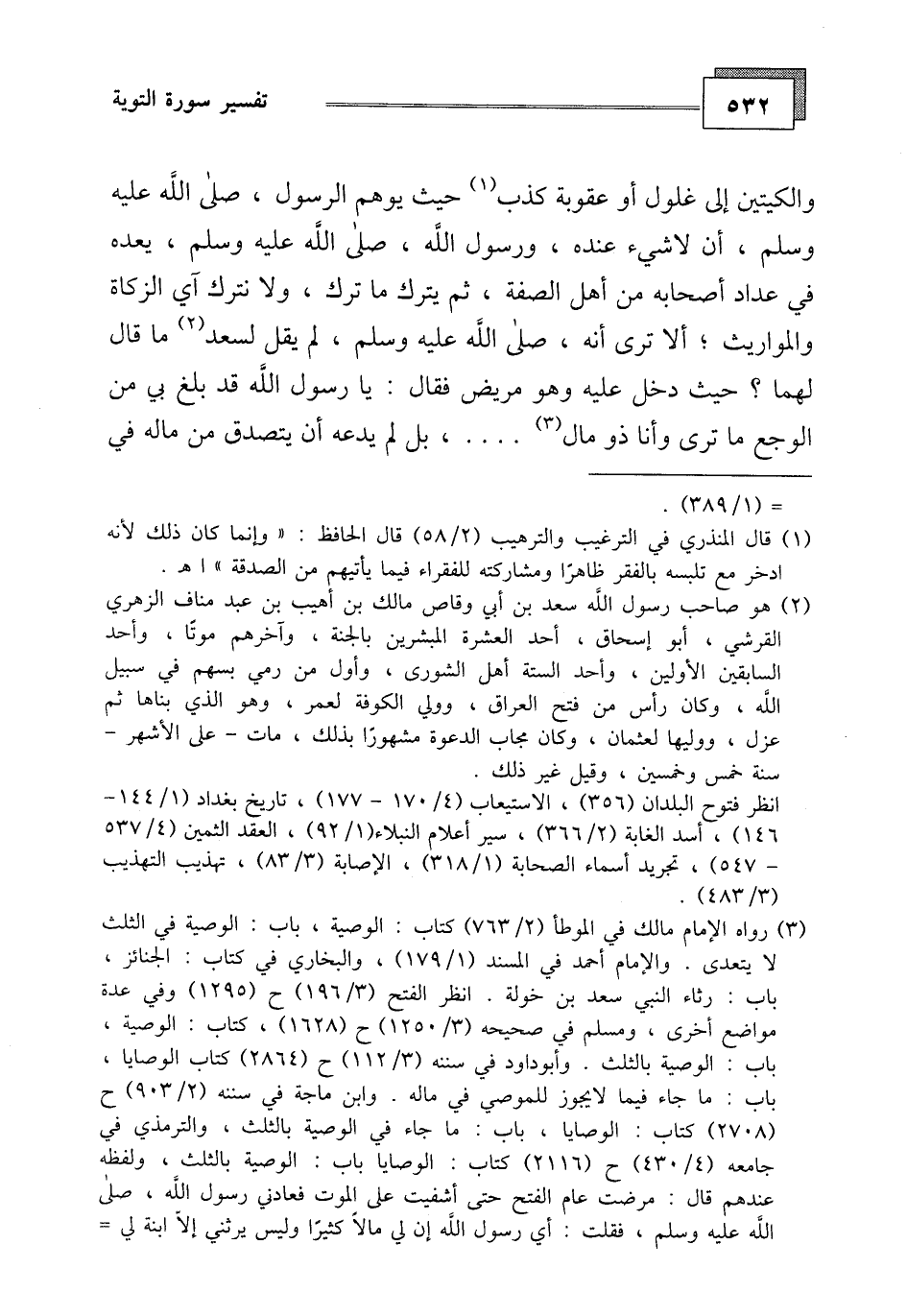 والكيتين إلى غلول أو عقوبة كذب حيث يوهم الرسول، صلى الله عليه وسلم، أن لا شيء عنده، ورسول الله، صلى الله عليه وسلم، يعده في عداد أصحابه من أهل الصفة، ثم يترك ما ترك، ولا نترك آي الزكاة والمواريث، ألا ترى أنه، صلى الله عليه وسلم، لم يقل لسعد ما قال لهما، حيث دخل عليه وهو مريض فقال: يا رسول الله قد بلغ بي من الوجع ما ترى وأنا ذو مال، بل لم يدعه أن يتصدق من ماله في