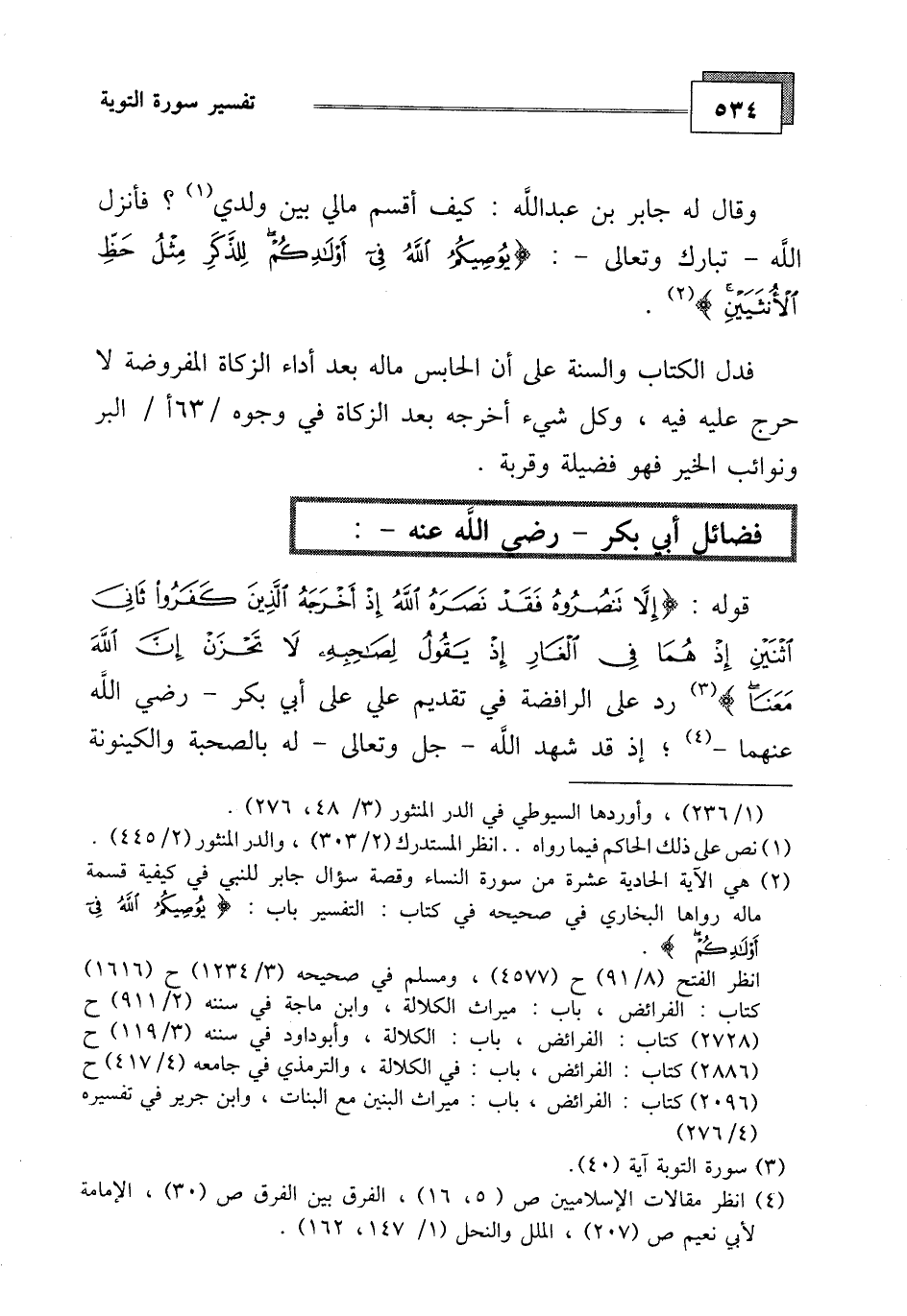 وقال له جابر بن عبد الله: كيف أقسم مالي بين ولدي، فأنزل الله - تبارك وتعالى -: (يُوصِيكُمُ اللَّهُ فِي أَوْلَادِكُمْ لِلذَّكَرِ مِثْلُ حَظِّ الْأُنْثَيَيْنِ) .