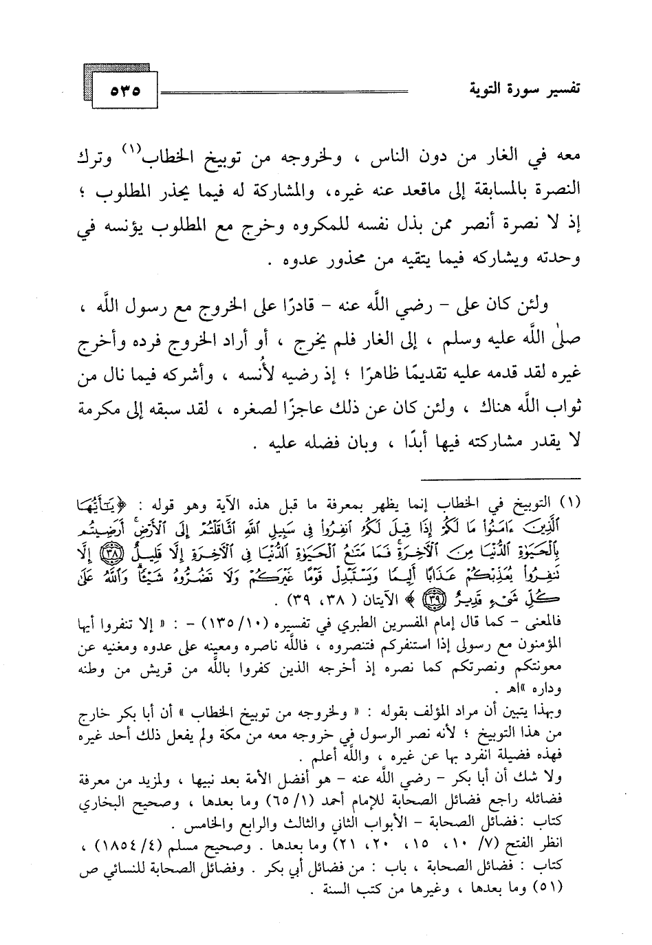 معه في الغار من دون الناس، ولخروجه من توبيخ الخطاب وترك النصرة بالمسابقة إلى ما قعد عنه غيره، والمشاركة له فيما يحذر المطلوب، إذ لا نصرة أنصر ممن بذل نفسه للمكروه وخرج مع المطلوب يؤنسه في وحدته ويشاركه فيما يتقيه من محذور عدوه.