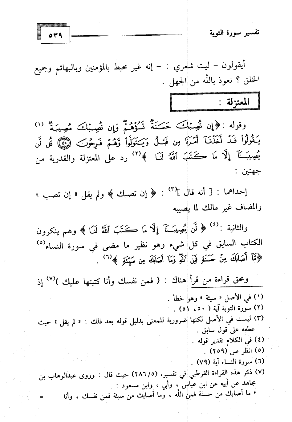 وقوله: (إِنْ تُصِبْكَ حَسَنَةٌ تَسُؤْهُمْ وَإِنْ تُصِبْكَ مُصِيبَةٌ يَقُولُوا قَدْ أَخَذْنَا أَمْرَنَا مِنْ قَبْلُ وَيَتَوَلَّوْا وَهُمْ فَرِحُونَ (50) قُلْ لَنْ يُصِيبَنَا إِلَّا مَا كَتَبَ اللَّهُ لَنَا)