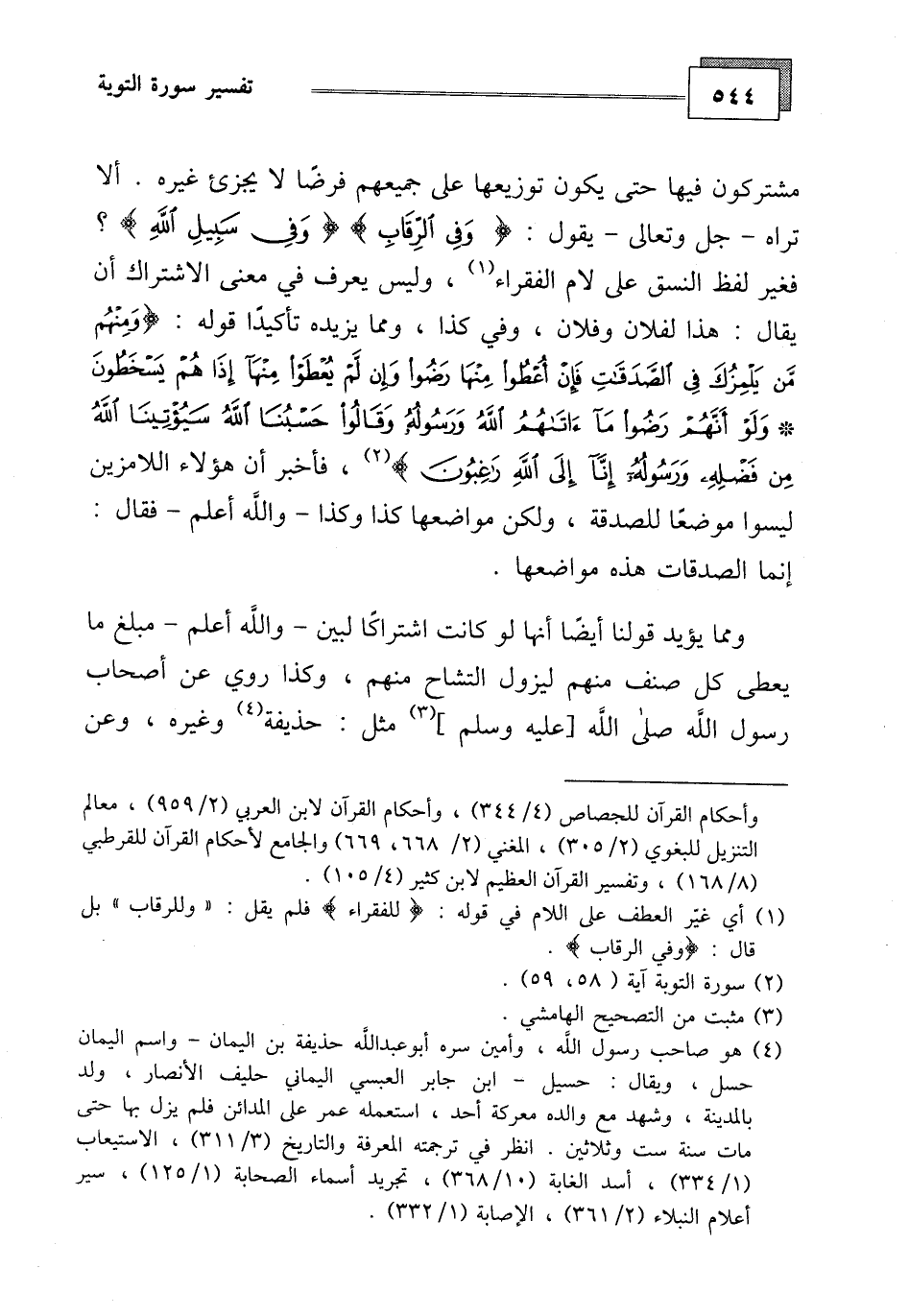 ومما يؤيد قولنا أيضا أنها لو كانت اشتراكاً لبين - والله أعلم - مبلغ ما يعطى كل صنف منهم ليزول التشاح منهم، وكذا روي عن أصحاب رسول الله صلى الله أعليه وسلم، مثل: حذيفة وغيره، وعن