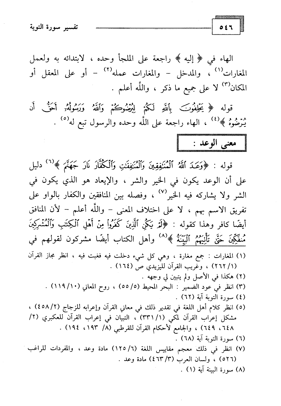 دليل على أن الوعد يكون في الخير والشر، والإبعاد هو الذي يكون في الشر ولا يشاركه فيه الخير، وفصله بين المنافقين والكفار بالواو على تفريق الاسم بهم، لا على اختلاف المعنى - والله أعلم - لأن المنافق أيضا كافر وهذا كقوله: (لَمْ يَكُنِ الَّذِينَ كَفَرُوا مِنْ أَهْلِ الْكِتَابِ وَالْمُشْرِكِينَ مُنْفَكِّينَ حَتَّى تَأْتِيَهُمُ الْبَيِّنَةُ (1)