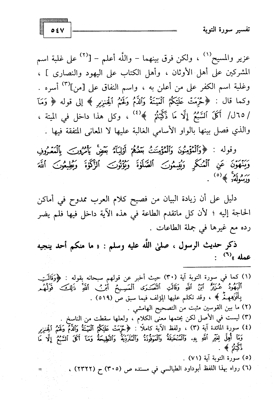 عزير والمسيح، ولكن فرق بينهما - والله أعلم - على غلبة اسم المشركين على أهل الأوثان، وأهل الكتاب على اليهود والنصارى،، وغلبة اسم الكفر على من أعلن به، واسم النفاق على من أسره. وكما قال: (حُرِّمَتْ عَلَيْكُمُ الْمَيْتَةُ وَالدَّمُ وَلَحْمُ الْخِنْزِيرِ)