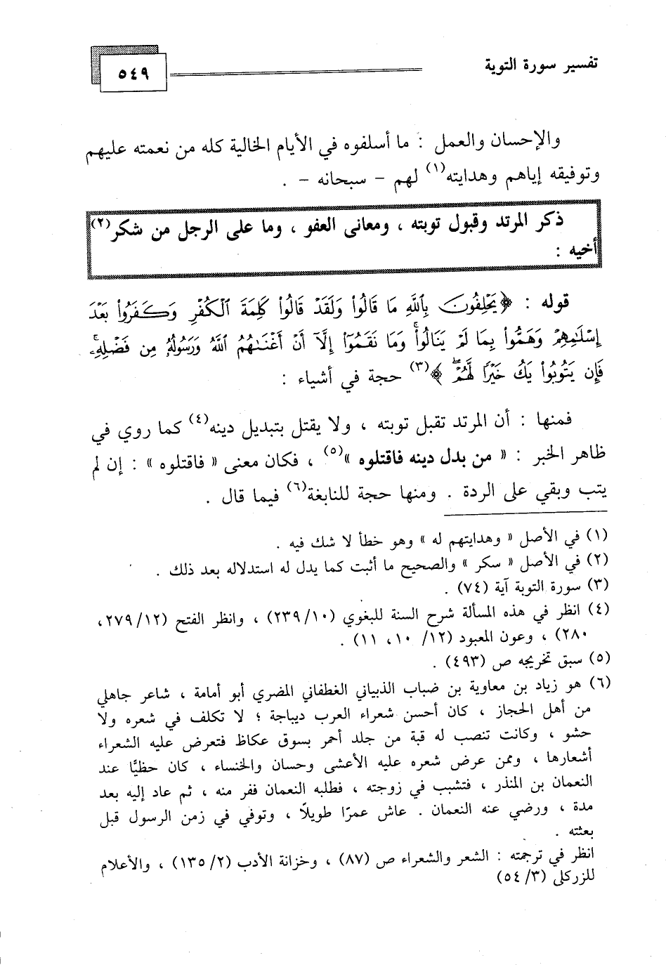 فمنها: أن المرتد تقبل توبته، ولا يقتل بتبديل دينه كما روي في ظاهر الخبر: " من بدل دينه فاقتلوه "، فكان معنى " فاقتلوه ": إن لم يتب وبقي على الردة. ومنها حجة للنابغة فيما قال: