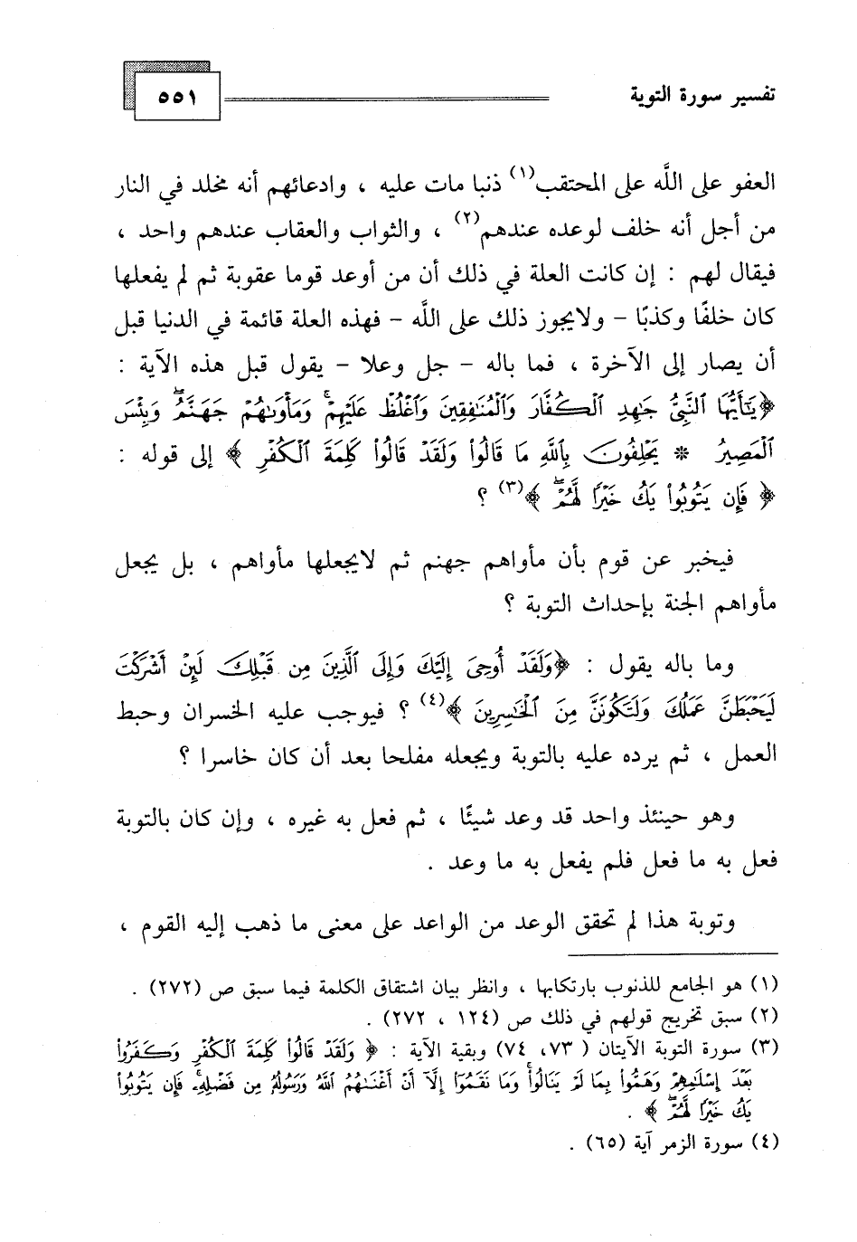 العفو على الله على المحتقب ذنبا مات عليه، وادعائهم أنه مخلد في النار من أجل أنه خلف لوعده عندهم، والثواب والعقاب عندهم واحد، فيقال لهم: إن كانت العلة في ذلك أن من أوعد قوما عقوبة ثم لم يفعلها كان خلفا وكذبا - ولا يجوز ذلك على الله - فهذه العلة قائمة في الدنيا قبل أن يصار إلى الآخرة، فما باله - جل وعلا - يقول قبل هذه الآية: (يَا أَيُّهَا النَّبِيُّ جَاهِدِ الْكُفَّارَ وَالْمُنَافِقِينَ وَاغْلُظْ عَلَيْهِمْ وَمَأْوَاهُمْ جَهَنَّمُ وَبِئْسَ الْمَصِيرُ (73) يَحْلِفُونَ بِاللَّهِ مَا قَالُوا وَلَقَدْ قَالُوا كَلِمَةَ الْكُفْرِ وَكَفَرُوا بَعْدَ إِسْلَامِهِمْ وَهَمُّوا بِمَا لَمْ يَنَالُوا وَمَا نَقَمُوا إِلَّا أَنْ أَغْنَاهُمُ اللَّهُ وَرَسُولُهُ مِنْ فَضْلِهِ فَإِنْ يَتُوبُوا يَكُ خَيْرًا لَهُمْ) .