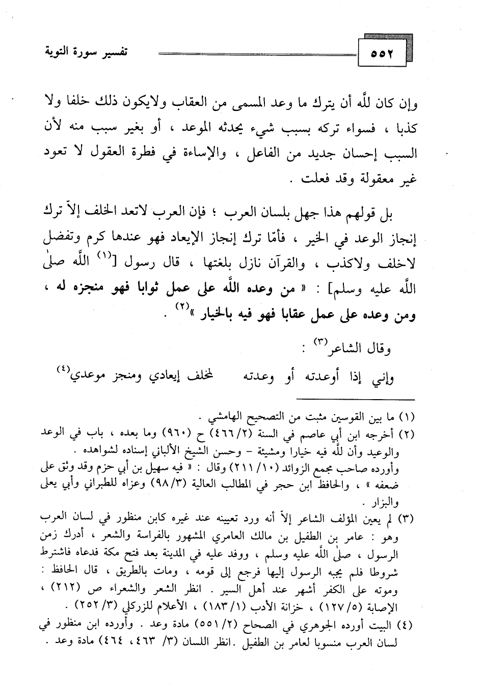 بل قولهم هذا جهل بلسان العرب، فإن العرب لا تعد الخلف إلي ترك إنجاز الوعد في الخير، فأما ترك إنجاز الإيعاد فهو عندها كرم وتفضل لا خلف ولا كذب، والقرآن نازل بلغتها، قال رسول الله صلى الله عليه وسلم،: " من وعده الله على عمل ثوابا فهو منجزه له، ومن وعده على عمل عقابا فهو فيه بالخيار ".