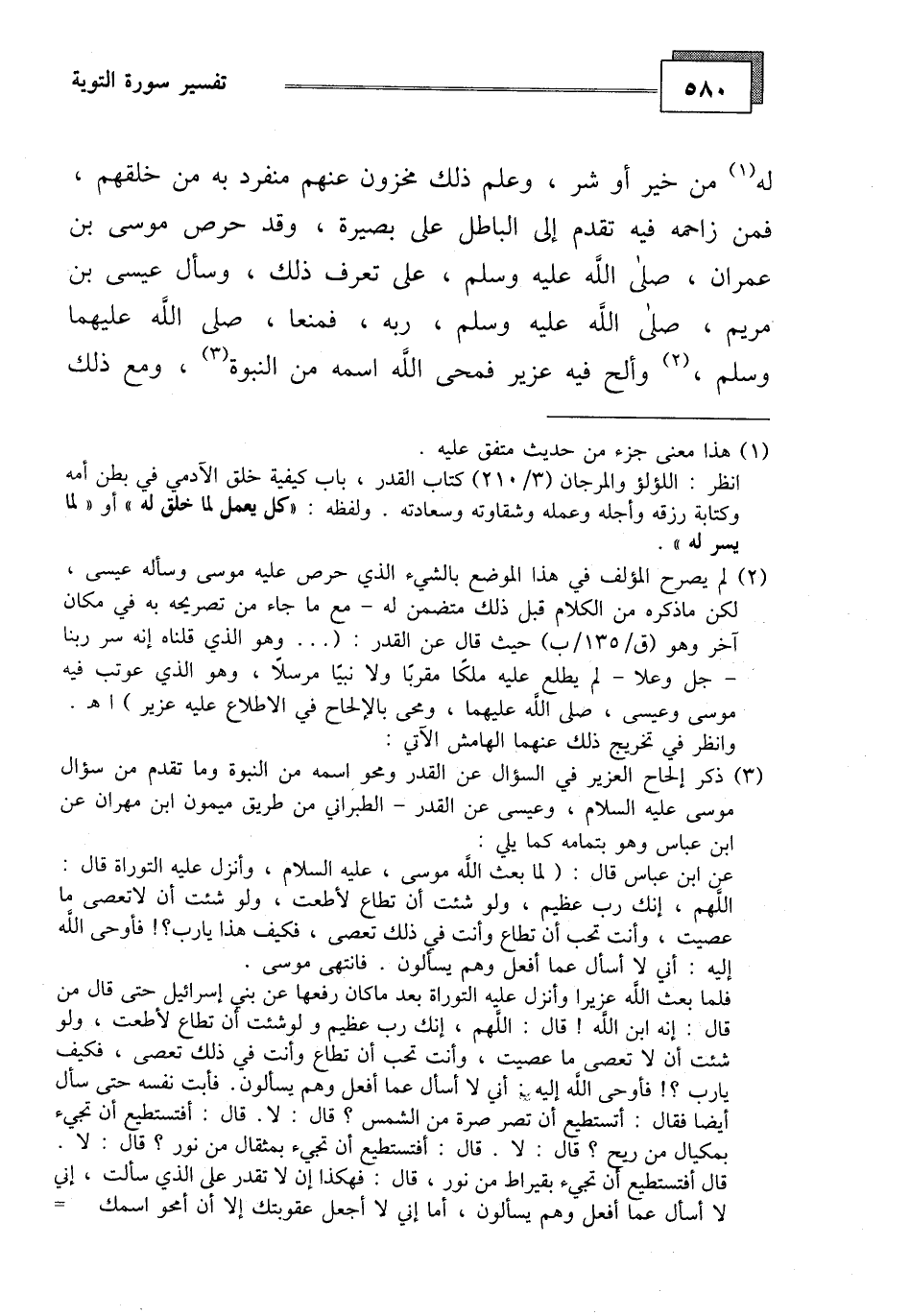 (3) ذكر إلحاح العزير في السؤال عن القدر ومحو اسمه من النبوة وما تقدم من سؤال موسى عليه السلام، وعيسى عن القدر - الطبراني من طريق ميمون ابن مهران عن ابن عباس وهو بتمامه كما يلي: