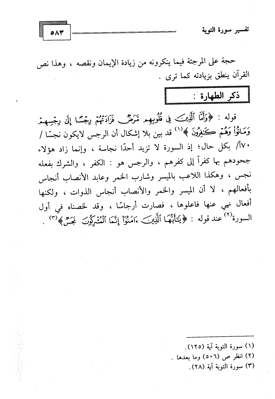 قد بين بلا إشكال أن الرجس لا يكون نجسا بكل حال، إذ السورة لا تزيد أحداً نجاسة، وإنما زاد هؤلاء جحودهم بها كفرا إلى كفرهم، والرجس هو: الكفر، والشرك بفعله نجس، وهكذا اللاعب بالميسر وشارب الخمر وعابد الأنصاب أنجاس بأفعالهم، لا أن الميسر والخمر والأنصاب أنجاس الذوات، ولكنها أفعال نهي عنها فاعليها، فصارت أرجاسا، وقد لخصناه في أول السورة عند قوله: (يَا أَيُّهَا الَّذِينَ آمَنُوا إِنَّمَا الْمُشْرِكُونَ نَجَسٌ) .