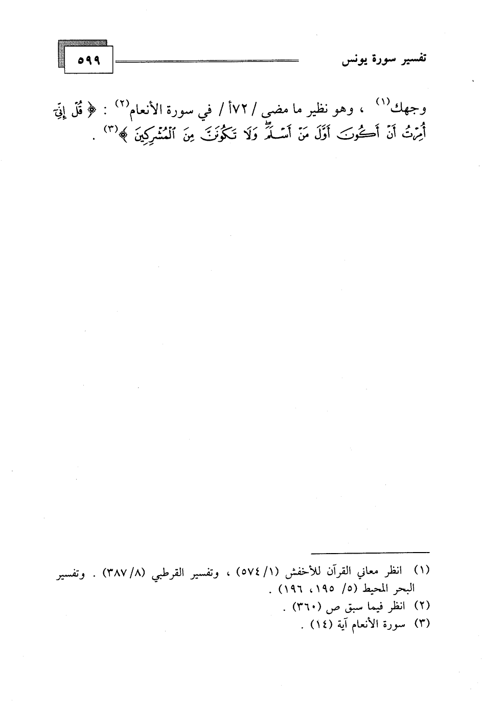 وجهك، وهو نظير ما مضى في سورة الأنعام: (قُلْ إِنِّي أُمِرْتُ أَنْ أَكُونَ أَوَّلَ مَنْ أَسْلَمَ وَلَا تَكُونَنَّ مِنَ الْمُشْرِكِينَ (14) .