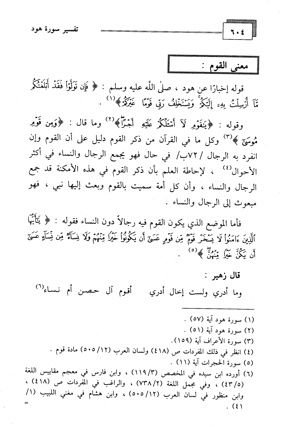 وكل ما في القرآن من ذكر القوم دليل على أن القوم وإن انفرد به الرجال في حال فهو يجمع الرجال والنساء في أكثر الأحوال، لإحاطة العلم بأن ذكر القوم في هذه الأمكنة قد جمع الرجال والنساء، وأن كل أمة سميت بالقوم وبعث إليها نبي، فهو مبعوث إلى الرجال والنساء.