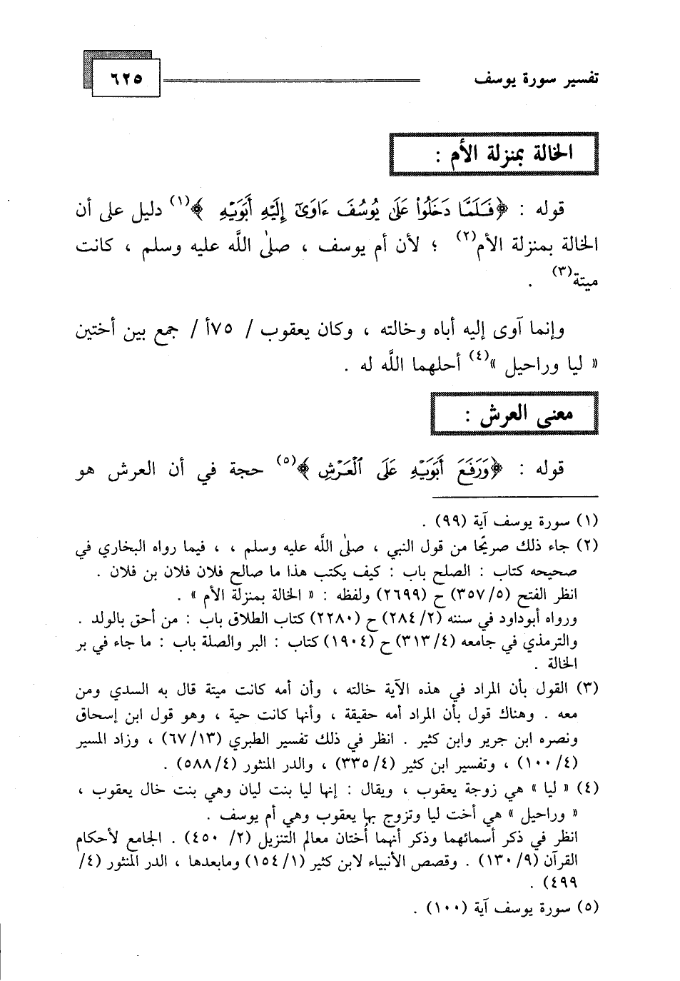 دليل على أن الخالة بمنزلة الأم، لأن أم يوسف، صلى الله عليه وسلم، كانت ميتة.