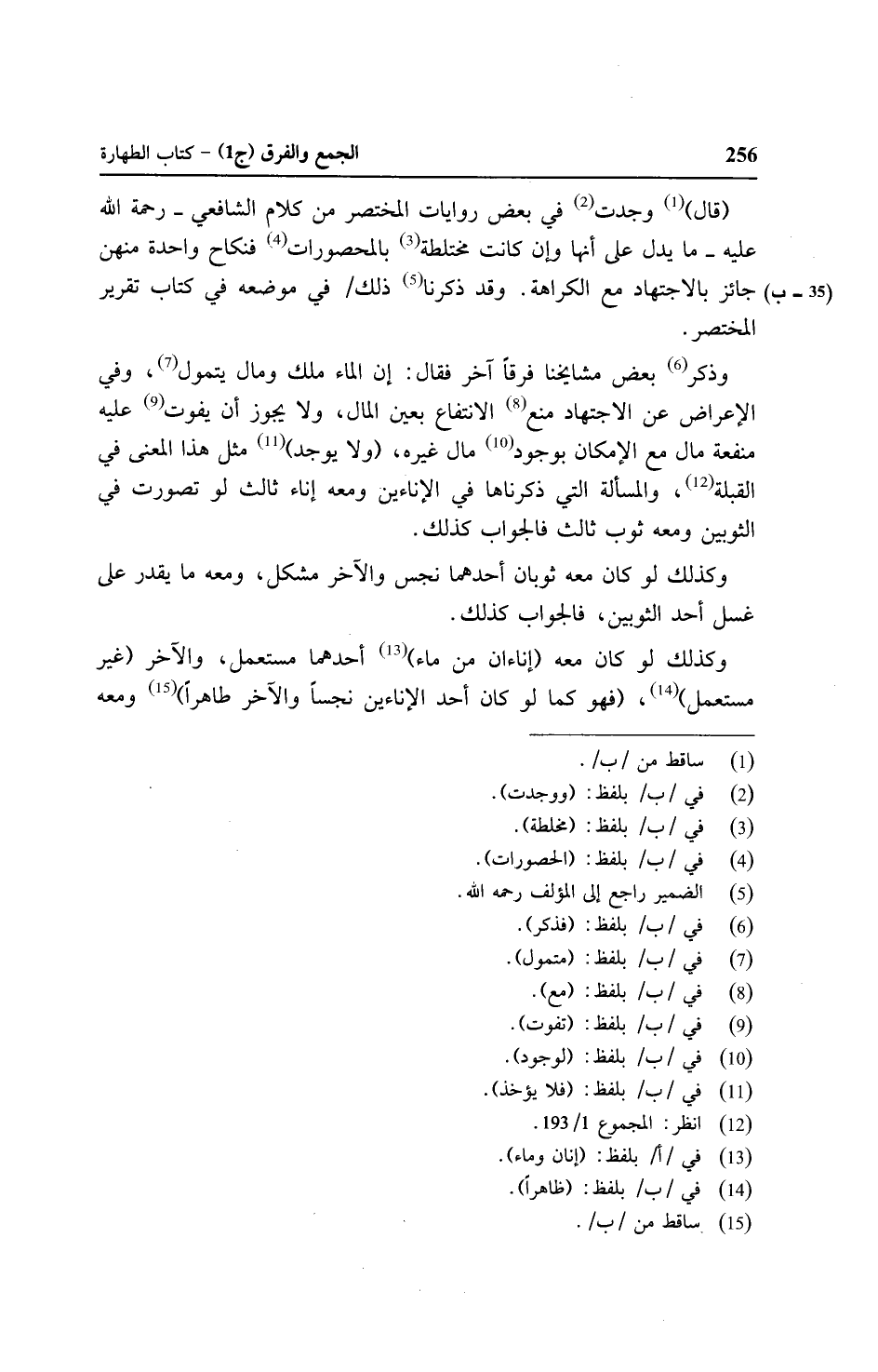 وذكر بعض مشايخنا فرقاً آخر فقال: إن الماء ملك ومال يتمول، وفي الإعراض عن الاجتهاد معنى الانتفاع بعين المال، ولا يجوز أن يفوت عليه منفعة مال مع الإمكان بوجود مال غيره، (ولا يوجد) مثل هذا المعنى في القبلة، والمسألة التي ذكرناها في الإناءين ومعه إناء ثالث لو تصورت في الثوبين ومعه ثوب ثالث فالجواب كذلك.