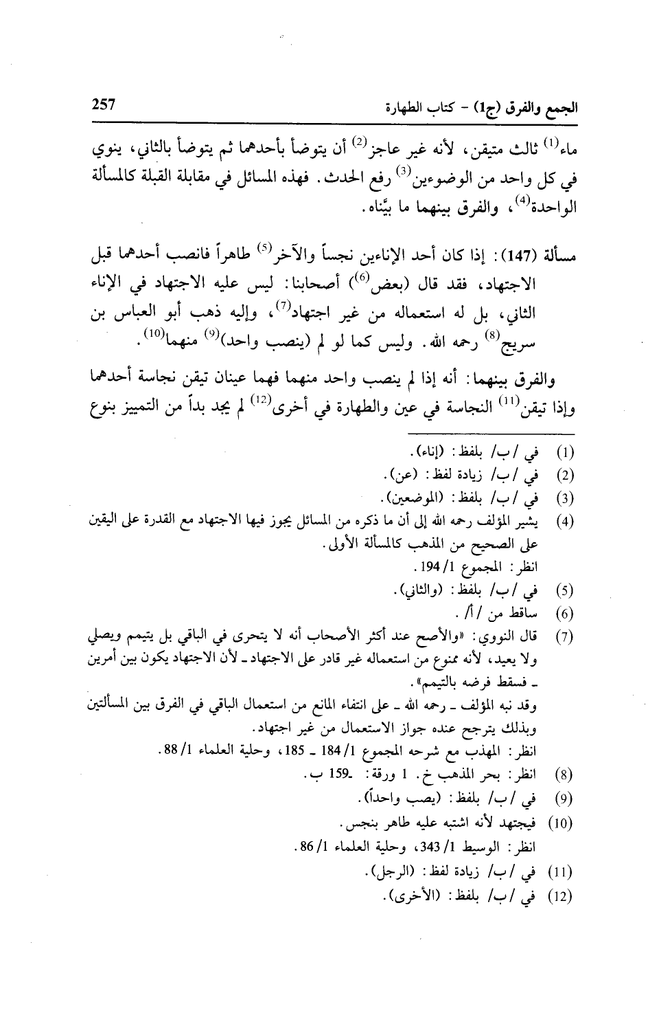 مسألة (١٤٧): إذا كان أحد الإناءين نجساً والآخر طاهراً فانصب أحدهما قبل الاجتهاد، فقد قال (بعض) أصحابنا: ليس عليه الاجتهاد في الإناء الثاني، بل له استعماله من غير اجتهاد، وإليه ذهب أبو العباس بن سريج رحمه الله. وليس كما لو لم (ينصب واحد) منهما.