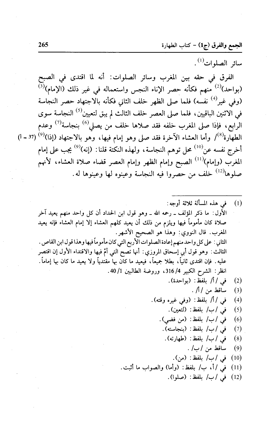 الفرق في حقه بين المغرب وسائر الصلوات: أنه لما اقتدى في الصبح (بواحد) منهم فكأنه حصر الإناء النجس واستعماله في غير ذلك (الإمام) (وفي غير نفسه) فلما صلى الظهر خلف الثاني فكأنه بالاجتهاد حصر النجاسة في الاثنين الباقيين، فلما صلى العصر خلف الثالث لم يبق لتعيين النجاسة سوى الرابع، فإذا صلى المغرب خلفه فقد صلاها خلف من يصلي بنجاسة وعدم الطهارة/ وأما العشاء الآخرة فقد صلى وهو إمام فيها، وهو بالاجتهاد (إذا) أخرج نفسه عن محل توهم النجاسة، ولهذه النكتة قلنا: (إنه) يجب على إمام المغرب (وإمام) الصبح وإمام الظهر وإمام العصر قضاء صلاة العشاء، لأنهم صلوها خلف من حصروا فيه النجاسة وعينوه لها وعينوها له.