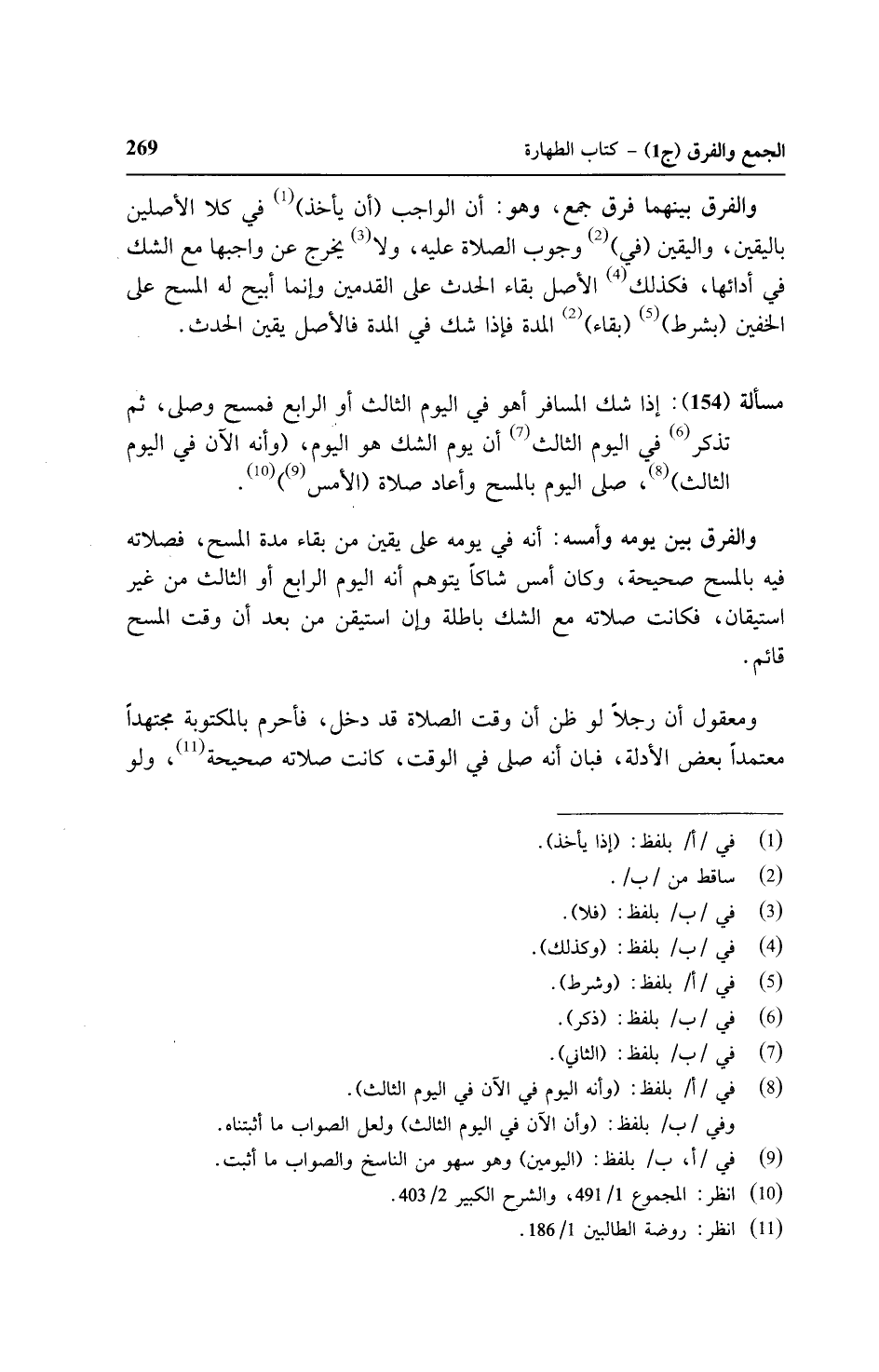 والفرق بينهما فرق جمع، وهو: أن الواجب (أن يأخذ) في كلا الأصلين باليقين، واليقين (في) وجوب الصلاة عليه، ولا يخرج عن واجبها مع الشك في أدائها، فكذلك الأصل بقاء الحدث على القدمين وإنما أبيح له المسح على الخفين (بشرط) (بقاء) المدة فإذا شك في المدة فالأصل يقين الحدث.