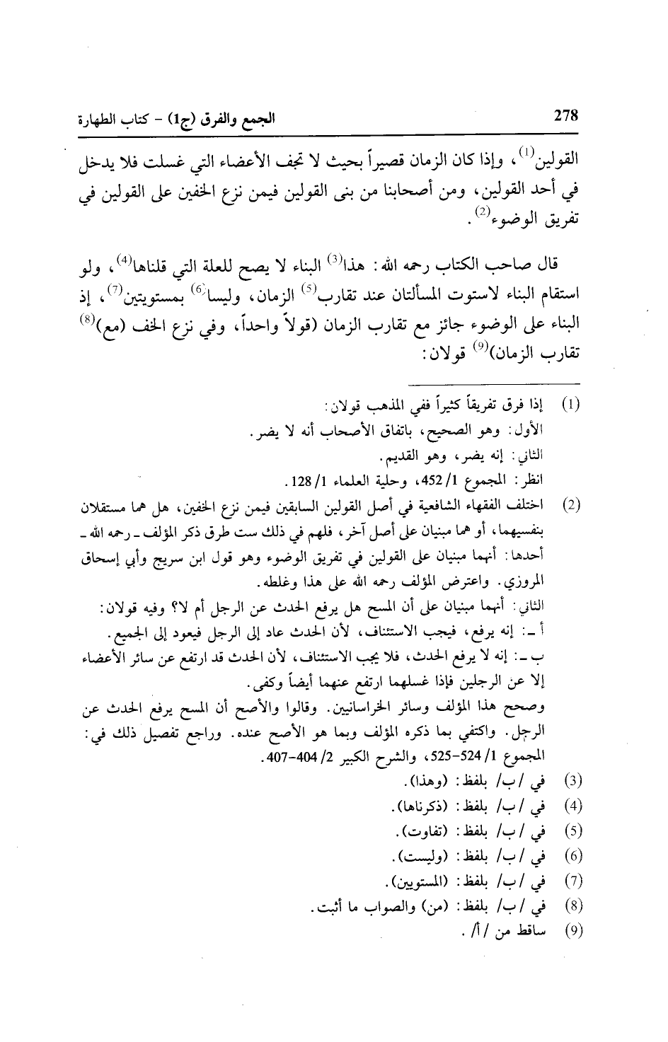 قال صاحب الكتاب رحمه الله: هذا البناء لا يصح للعلة التي قلناها، ولو استقام البناء لاستوت المسألتان عند تقارب الزمان، وليسا بمستويتين، إذا البناء على الوضوء جائز مع تقارب الزمان (قولاً واحداً، وفي نزع الخف (مع) تقارب الزمان) قولان: