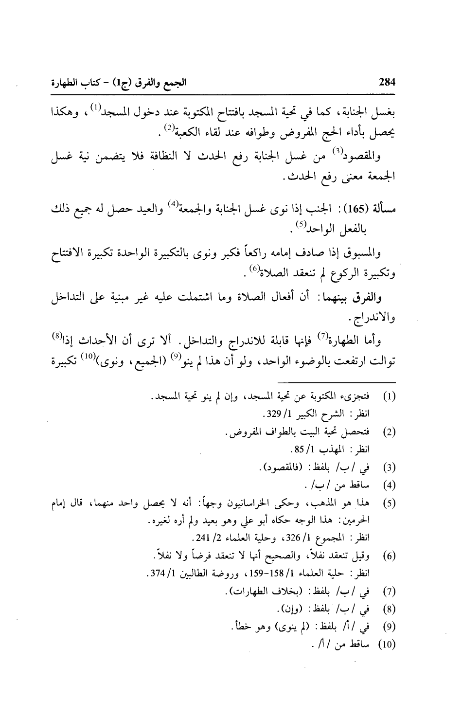 وأما الطهارة فإنها قابلة للاندراج والتداخل. ألا ترى أن الأحداث إذا توالت ارتفعت بالوضوء الواحد، ولو أن هذا لم ينو (الجميع، ونوى) تكبيرة