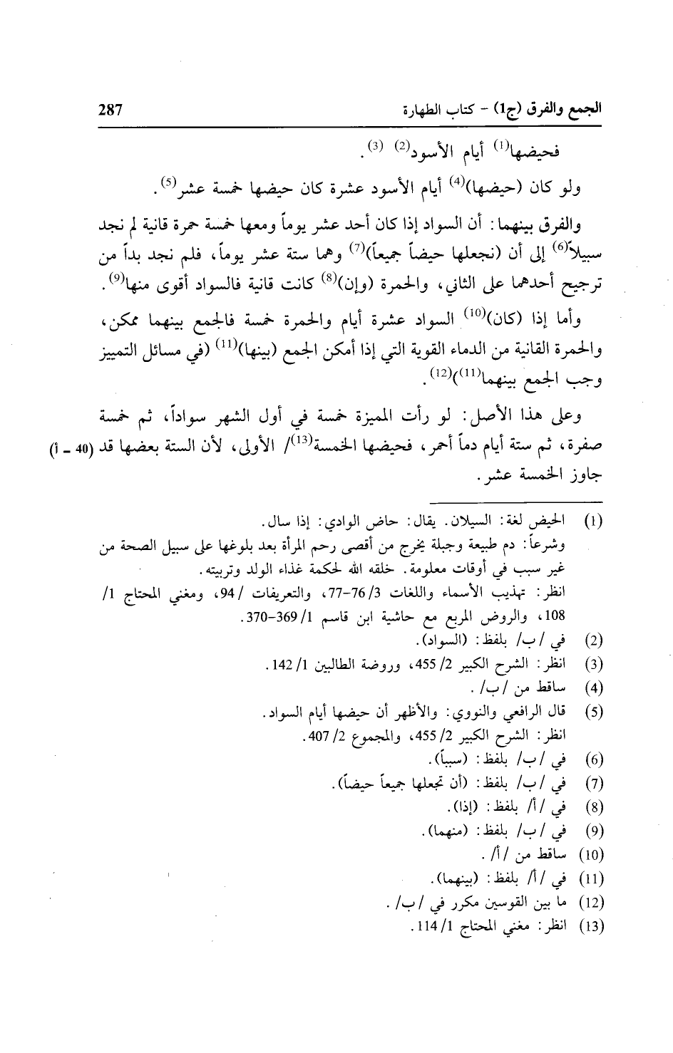 والفرق بينهما: أن السواد إذا كان أحد عشر يوماً ومعها خمسة حمرة قانية لم نجد سبيلاً إلى أن (نجعلها حيضاً جميعاً) وهما ستة عشر يوماً، فلم نجد بداً من ترجيح أحدهما على الثاني، والحمرة (وإن) كانت قانية فالسواد أقوى منها.