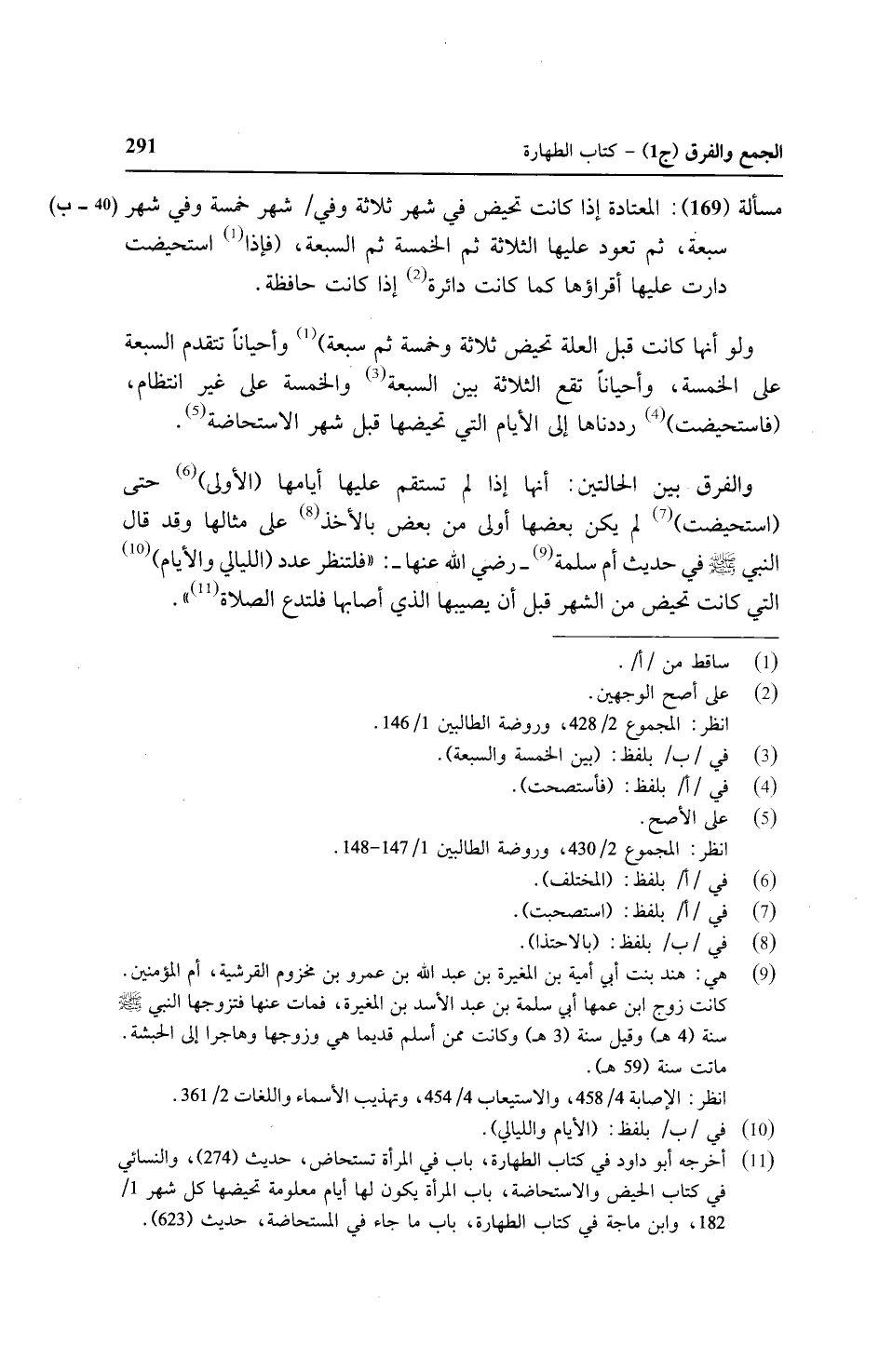 مسألة (١٦٩): المعتادة إذا كانت تحيض في شهر ثلاثة وفي شهر خمسة وفي/ (٤٠ - ب) شهر سبعة، ثم تعود عليها الثلاثة ثم الخمسة ثم السبعة، (فإذا استحيضت دارت عليها أقراؤها كما كانت دائرة إذا كانت حافظة.