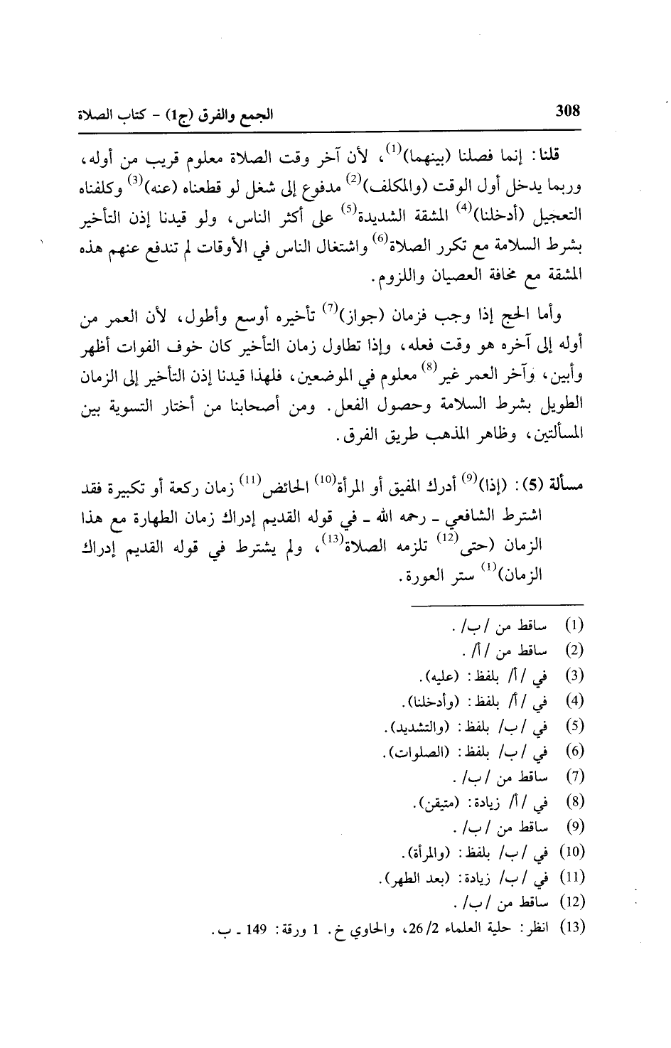 مسألة (٥): (إذا) أدرك المفيق أو المرأة الحائض زمان ركعة أو تكبيرة فقد اشترط الشافعي - رحمه الله - في قوله القديم إدراك زمان الطهارة مع هذا الزمان (حتى تلزمه الصلاة، ولم يشترط في قوله القديم إدراك الزمان) ستر العورة.