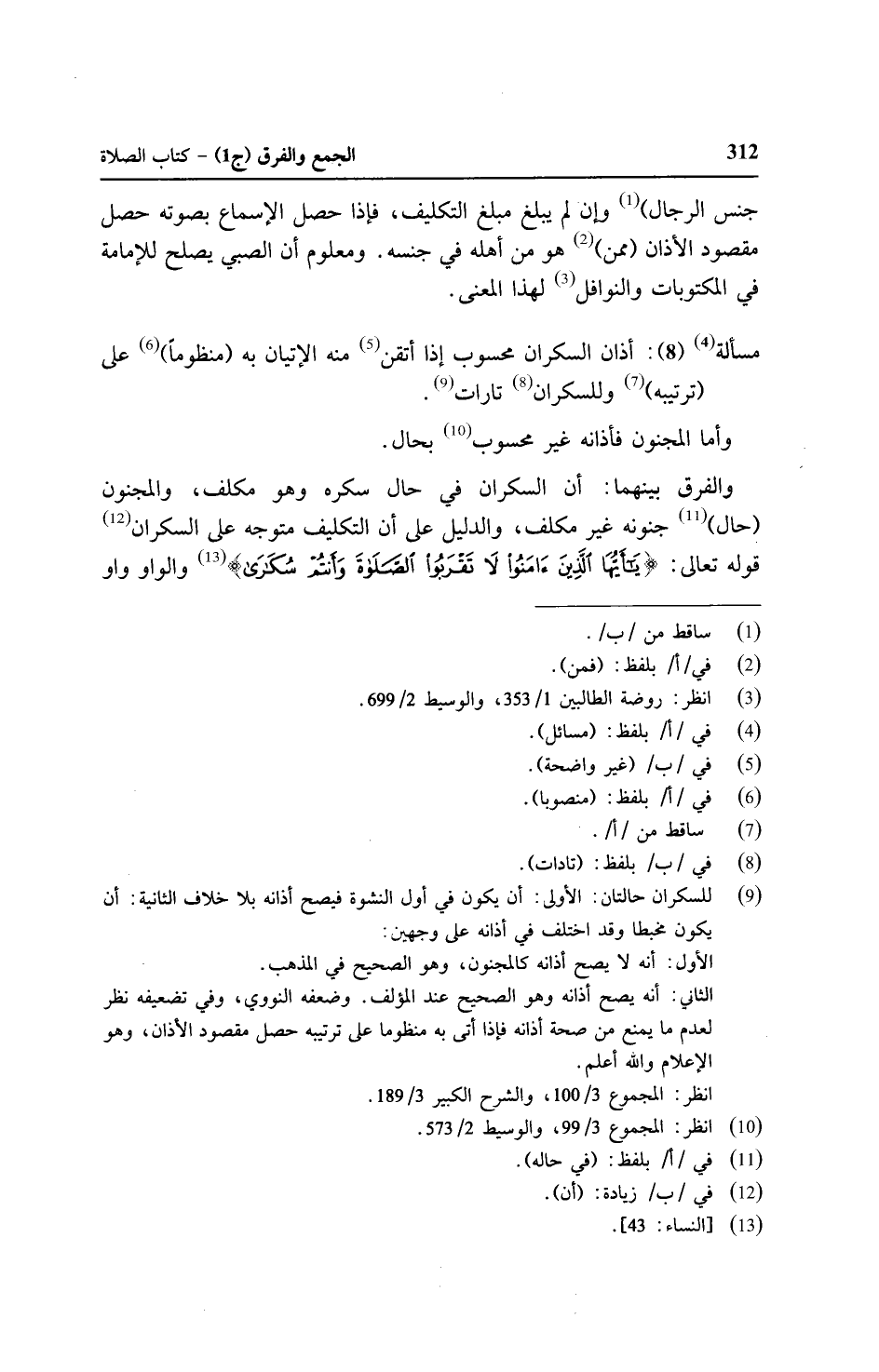والفرق بينهما: أن السكران في حال سكره وهو مكلف، والمجنون (حال) جنونه غير مكلف، والدليل على أن التكليف متوجه على السكران قوله تعالى: {يَا أَيُّهَا الَّذِينَ آمَنُوا لاَ تَقْرَبُوا الصَّلاَةَ وَأَنتُمْ سُكَارَى} والواو واو
