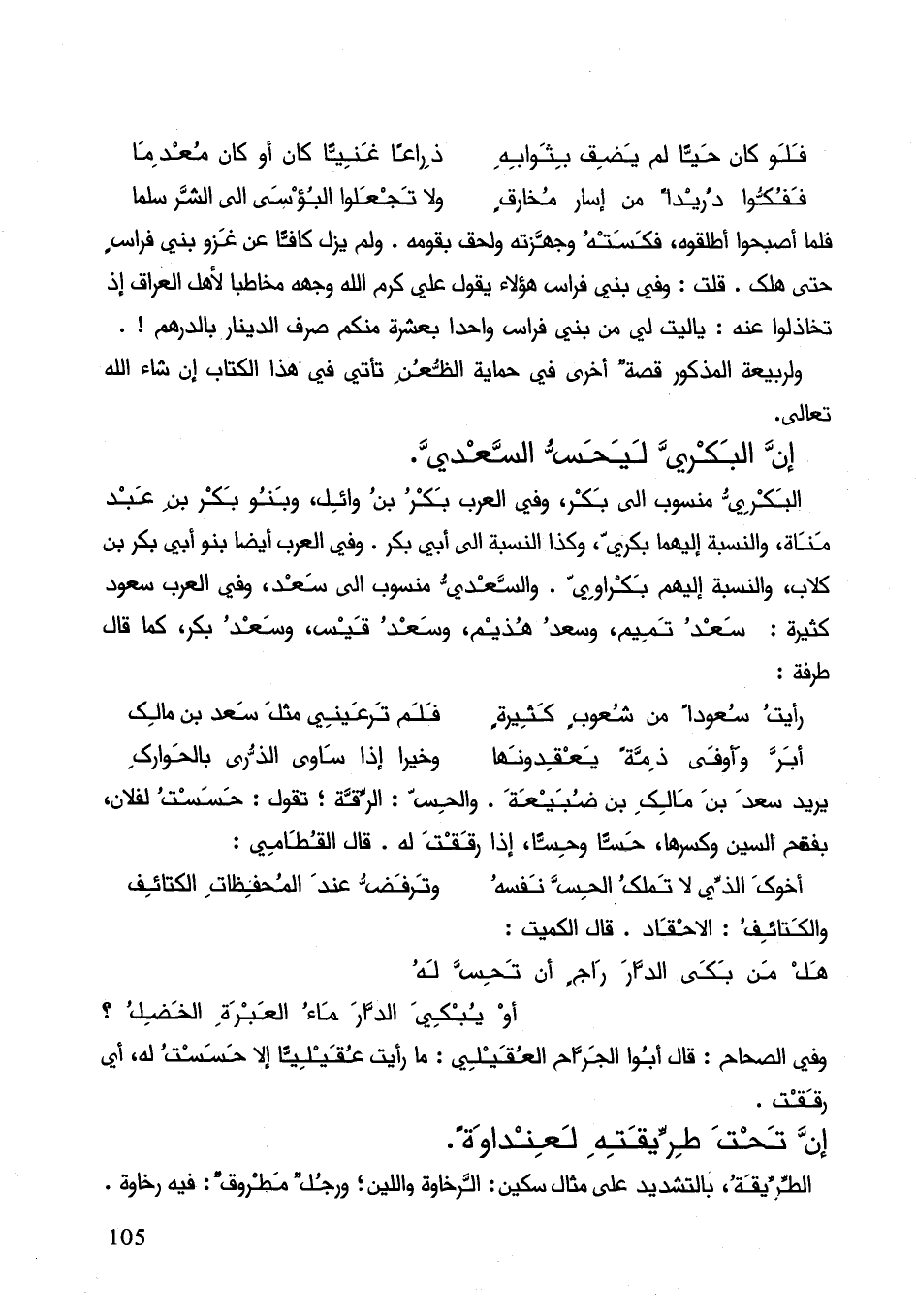البكري منسوب إلى بكر، وفي العرب بكر بن وائل، وبنو بكر بن عبد مناة، والنسب إليهم بكري، وكذال النسبة إلى أبي بكر. وفي العرب أيضاً بنو أبي بكر بن كلاب، والنسبة إليهم بكراوي. والسعدي منسوب إلى سعد، وفي العرب سعود كثيرة: سعد تميم وسعد هذيم وسعد قيس وسعد بكر، كما قال طرفة: