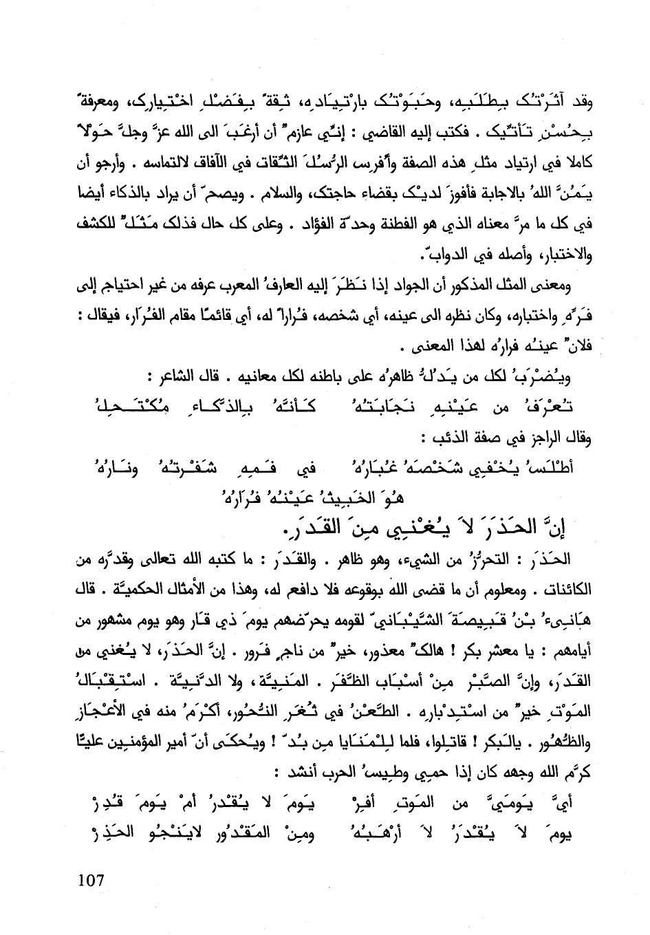 الحذر: التحرز من الشيء وهو ظاهر. والقدر: ما كتبه الله تعالى وقدره من الكائنات. ومعلوم أن ما قضى الله بوقعه فلا دافع له، وهذا من الأمثال الحكيمة. قال هانئ بن قبيصة الشيباني لقومه يحضهم يوم ذي قار وهو يوم مشهور أيامهم: يا معشر بكر! هالك معذور خير من ناج فرور. إنّ الحذر لا يغني من القدر، وإنّ الصبر من أسباب الظفر. المنية ولا الدنية. استقبال الموت خير من أستدباره. الطعن في ثغر النحور أكرم منه في الأعجاز والظهور. يا آل بكر! قاتلوا، فما للمنايا من بد! ويحكى أنّ أمير المؤمنين عليا كرم الله وجهه كان إذا حمي وطيس الحرب انشد: