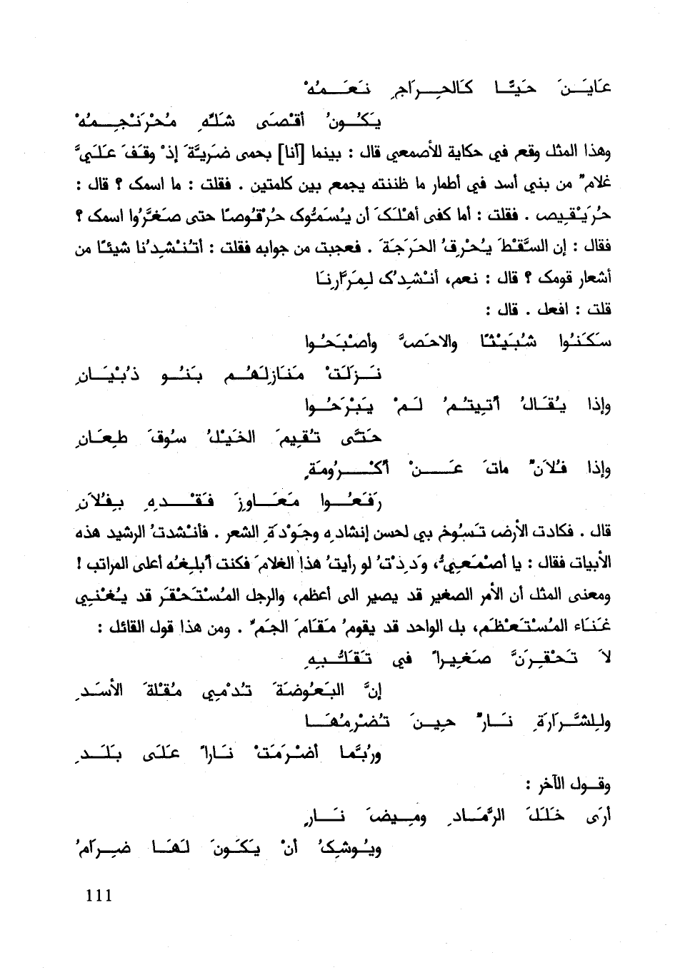 قال. فكادت الأرض تسوخ بي لحسن إنشاده الشعر. فأنشدت الرشيد هذه الأبيات فقال: يا أصمعي، وددت لو رأيت هذا الغلام فكنت أبلغه أعلى المراتب! ومعنى المثل أنَّ الأمر الصغير قد يصير إلى أعظم، والرجل المستحقر قد يغني غناء المستعظم، بل الواحد قد يقوم مقام الجم. ومن هذا قول القائل:
