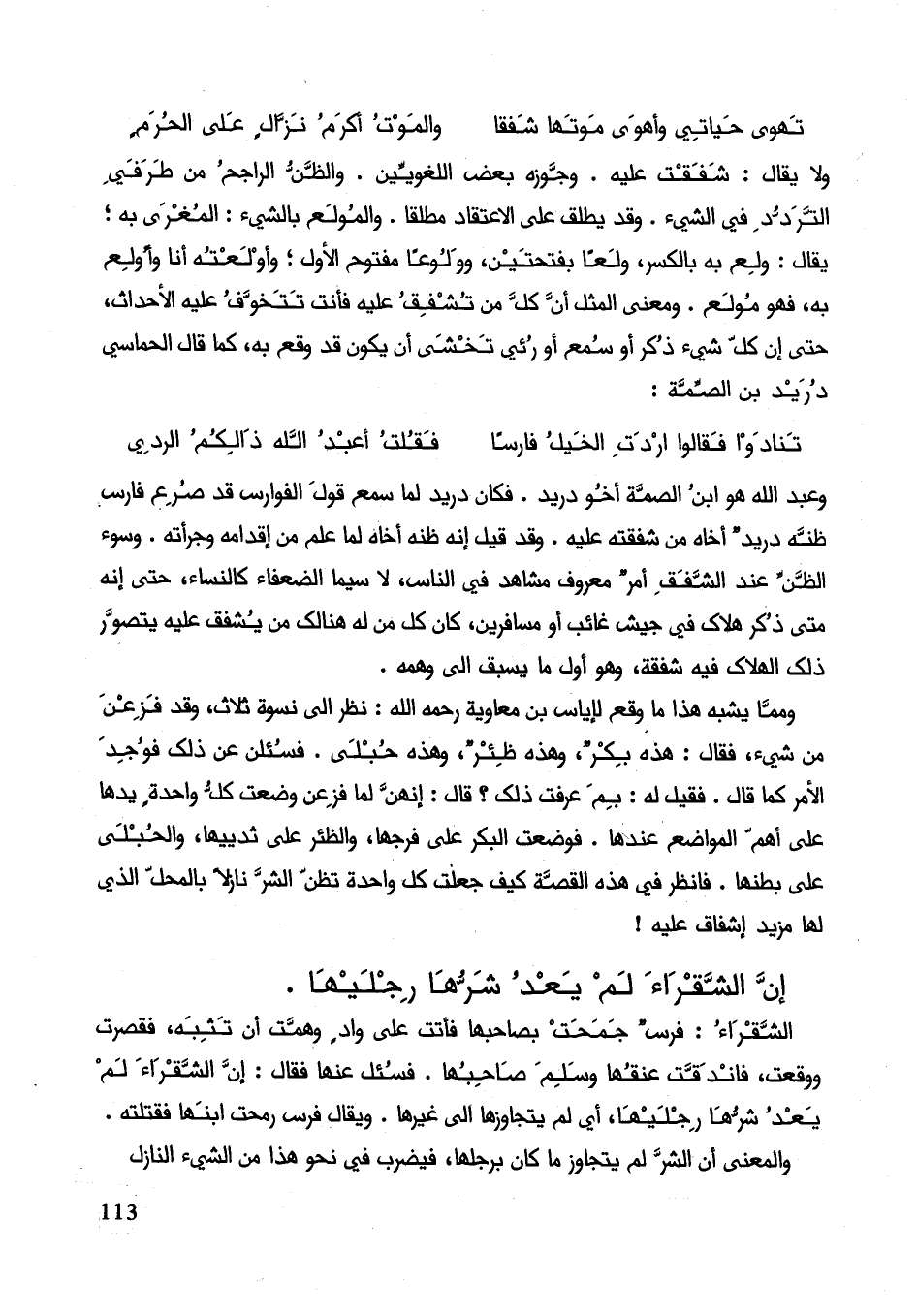 الشقراء: فرس جمحت بصاحبها فأتت على وادٍ وهمت أنَّ تثبه، فقصرت ووقعت، فاندقت عنقها وسلم صاحبها. فسئل عنها فقال: إنَّ الشقراء لم يعد شرها رجليها، أي لم يتجاوزها إلى غيرها. ويقال فرس رمحت ابنها فقتلته. والمعنى إنَّ الشر لم يتجاوز ما كان برجلها، فيضرب في النحو هذا من الشيء النازل