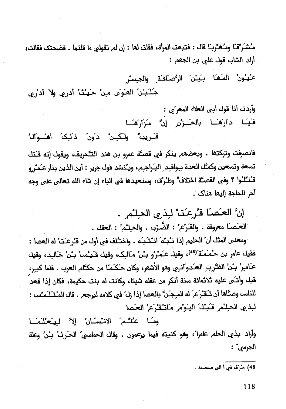 فانصرفت وتركتها. وبعضهم ينكر في قصة عمرو بن هند التحريق، ويقول إنّه قتل تسعة وتسعين وإكمال العدة بوافد البراجم، وينشد قول الجرير: أين الذين بنار عمرو قتلوا؟ وفي القصة اختلاف وطرق، وسنعيدها في الباء إنَّ شاء الله تعالى على وجه آخر للحاجة إليها هناك.