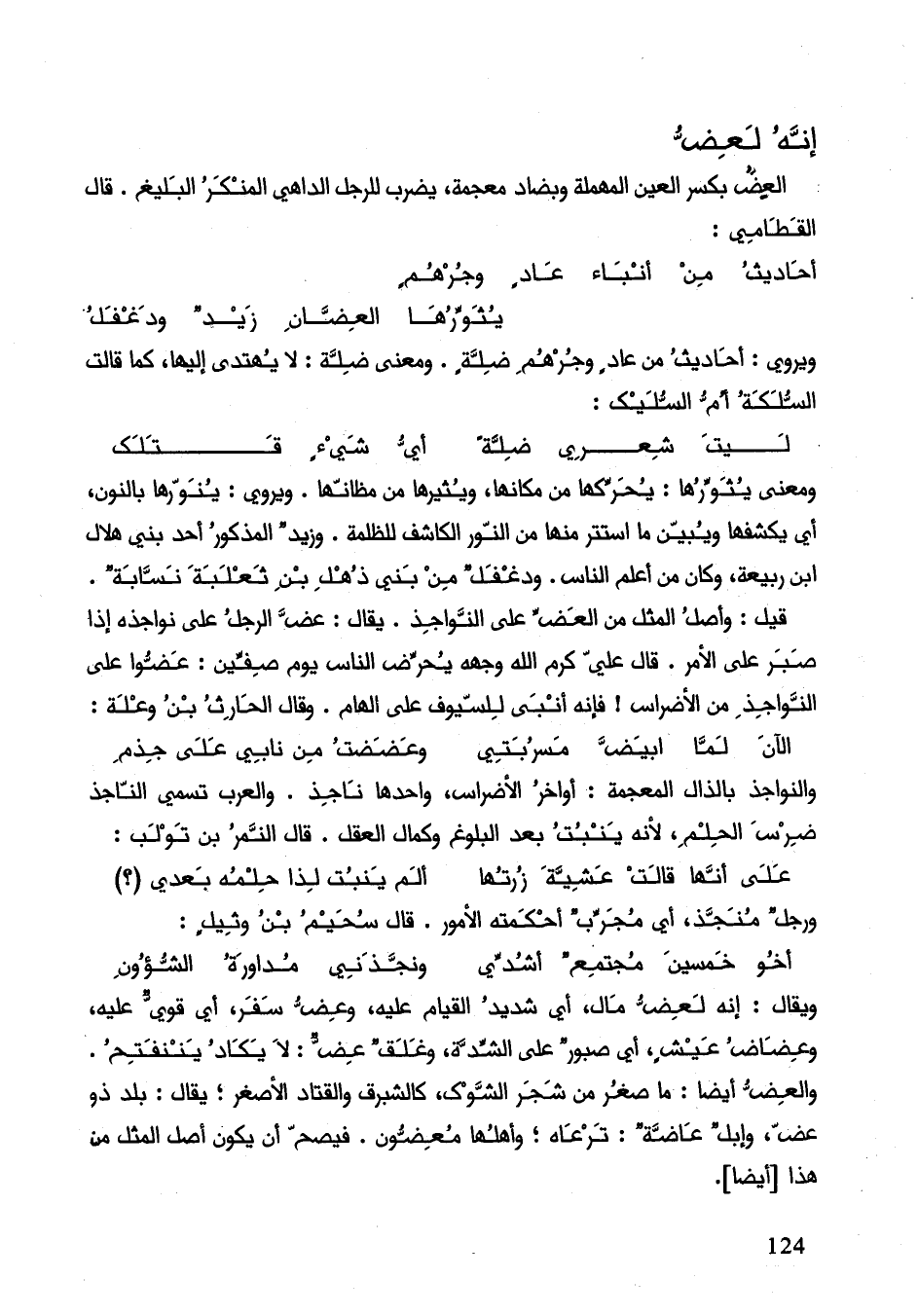العض بكسر العين المهملة وبضاد معجمة، يضرب للرجل الداهي المنكر البليغ. قال القطامي: