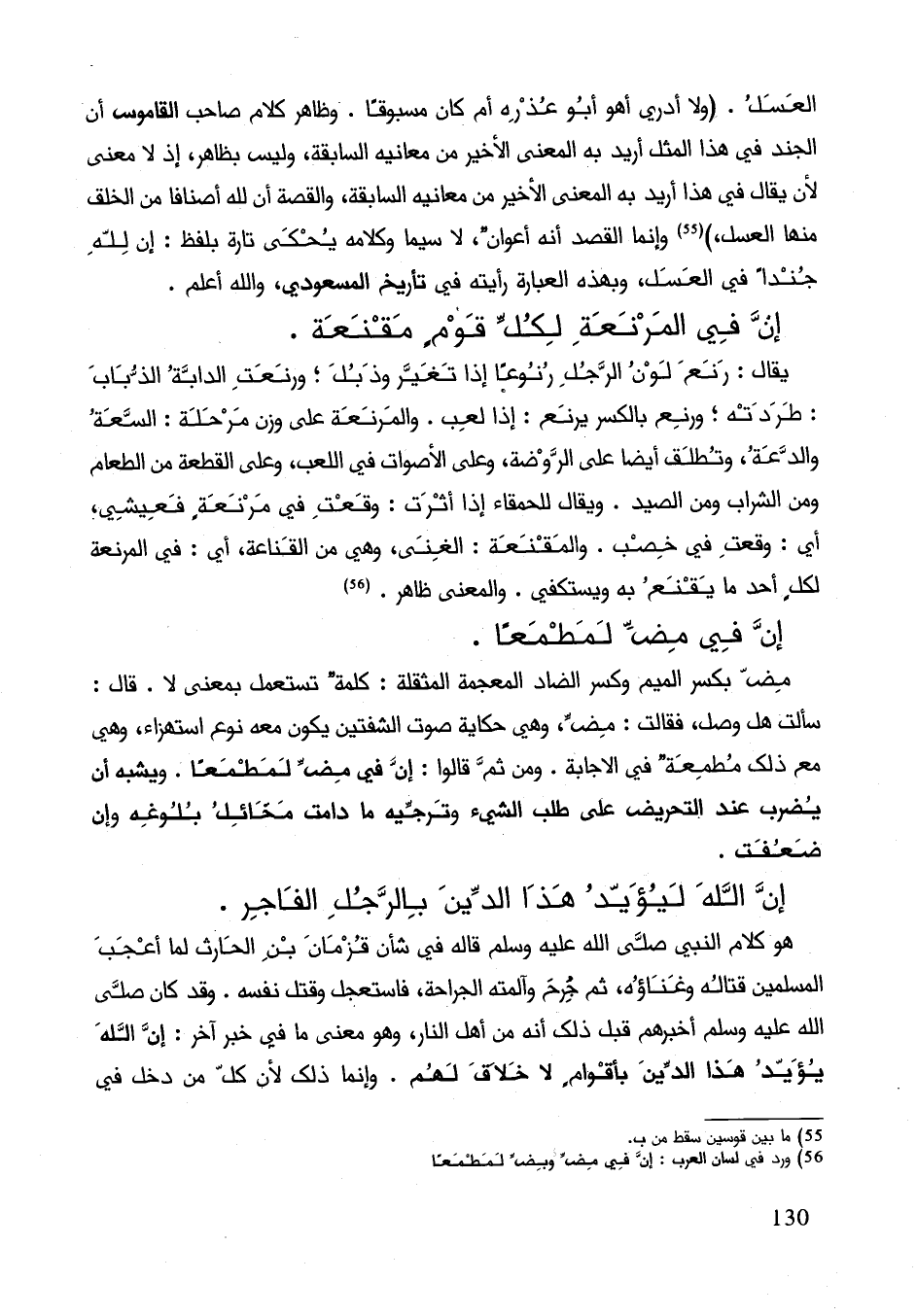 يقال: رنع لون الرجل رنوعا إذا تغير وذبل؛ ورنعت الدابة الذباب: طردته؛ ورنع بالكسر يرنع: إذا لعب. والمرنعة على وزن مرحلة: السعة والدعة، وتطلق أيضاً على الروضة، وعلى الأصوات في اللعب، وعلى القطعة من الطعام ومن الشراب ومن الصيد. ويقال للحمقاء إذا أثرت: وقعت في مرنعة فعيشي، أي: وقعت في خضب. والمقنعة: الغنى، وهي من القناعة، أي: في المرنعة لكل أحد ما يقنع به ويستكفي. والمعنى ظاهر.