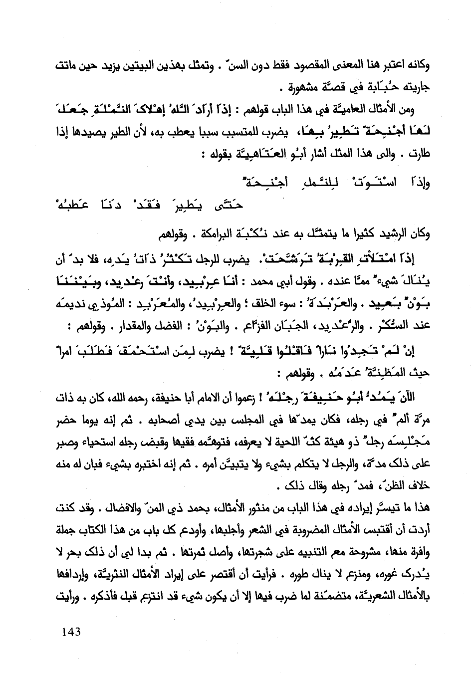 هذا ما تيسر إيراده في هذا الباب من منثور الأمثال، بحمد ذي المن والافضال. وقد كنت أردت إنَّ أقتبس الأمثال المضروبة في الشعر وأجلبها، وأودع كل باب من هذا الكتاب جملة وافرة منها، مشروحة مع التنبيه على شجرتها، واصل ثمرتها. ثم بدا لي أنَّ ذلك بحر لا يدرك غوره، ومنزع لا ينال طوره. فرأيت أنَّ اقتصر على إيراد الأمثال النثرية، وإردافها بالأمثال الشعرية، متضمنة لمّا ضرب فيها إلاّ أنَّ يكون شيء قد انتزع قبل فأذكره. ورأيت