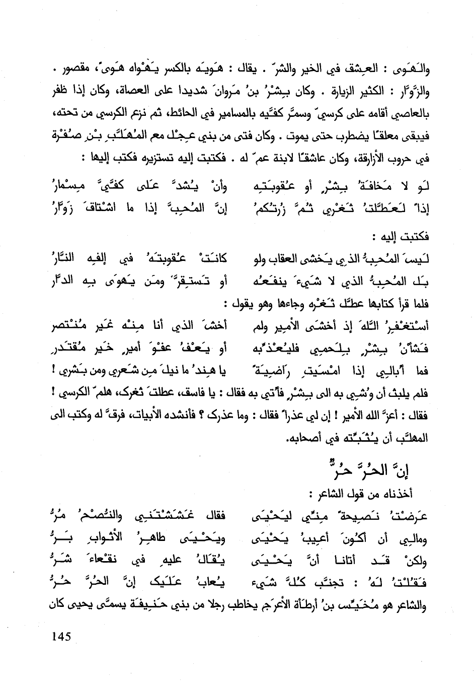 والزوار: الكثير الزيارة. وكان بشر بن مروان شديد على العصاة، وكان إذا ظفر بالعاصي أقامه على كرسي وسمر كفيه بالمسامير على الحائط، ثم نزع الكرسي من تحته، فيبقى معلقا يضطرب حتى يموت. وكان فتى من بني عجل مع المهلب بن صفرة في حروب الازارقة، وكان عاشقا لابنة عم له. فكتب إليه تستزيره فكتب إليها: