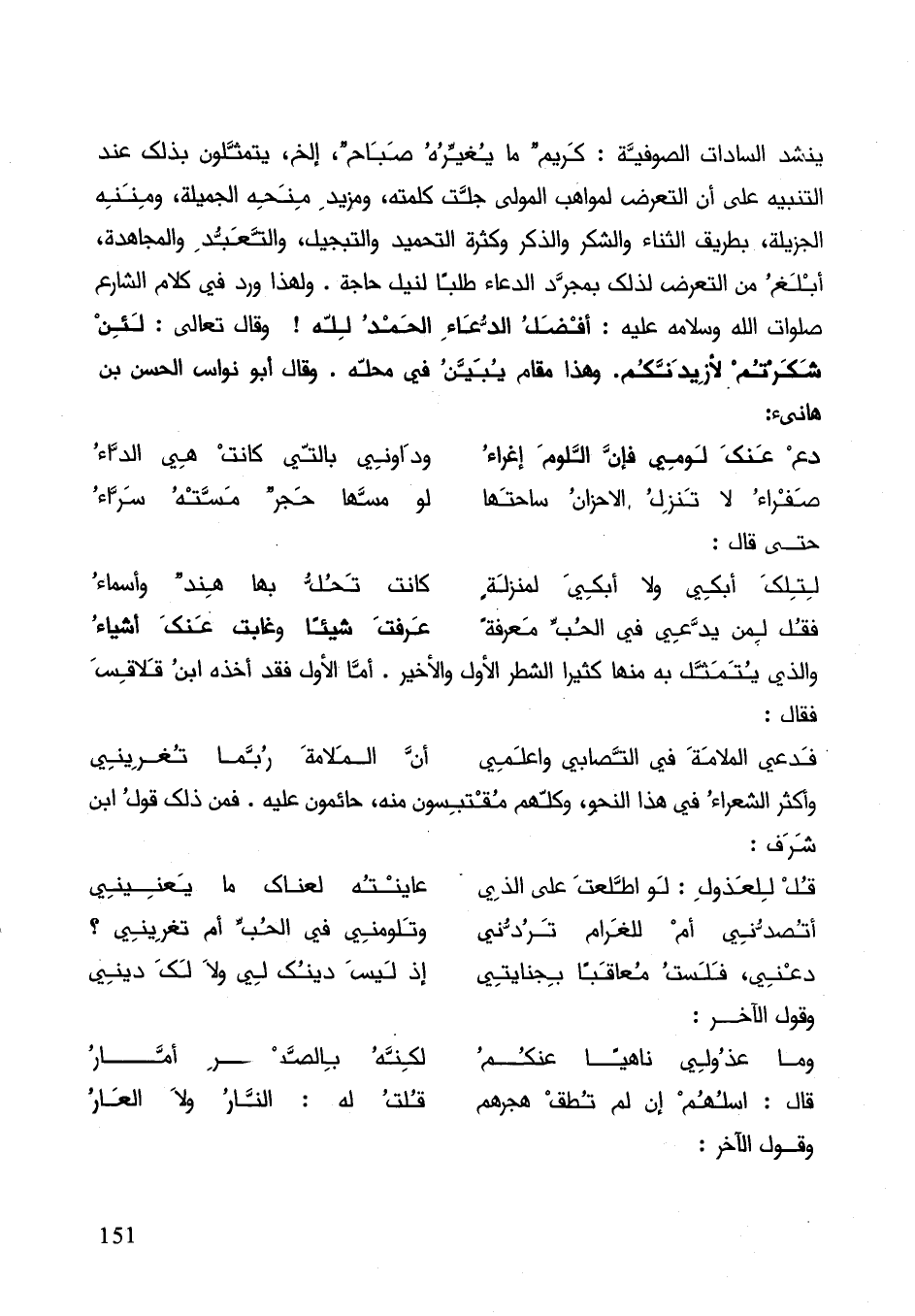ينشد السادات الصوفية: كريم ما يغيره صباح، الخ، يتمثلون بذلك عند التنبيه على أنَّ التعرض لمواهب المولى جلة كلمته، ومزيد منحه الجميلة ومنه الجزيلة بطريق الثناء والشكر والذكر وكثرة التحميد والتبجيل والتعبد والمجاهدة، أبلغ من التعرض لذلك بمجرد الدعاء طلبا لنيل حاجة. وهذا ورد في كلام الشارع صلوات الله وسلامه عليه: أفضل الدعاء الحمد لله! وقال تعالى:) لئن شكرتم لأزيدنكم (. وهذا مقام يبين في محله. وقال أبو نواس الحسن بن هانئ: