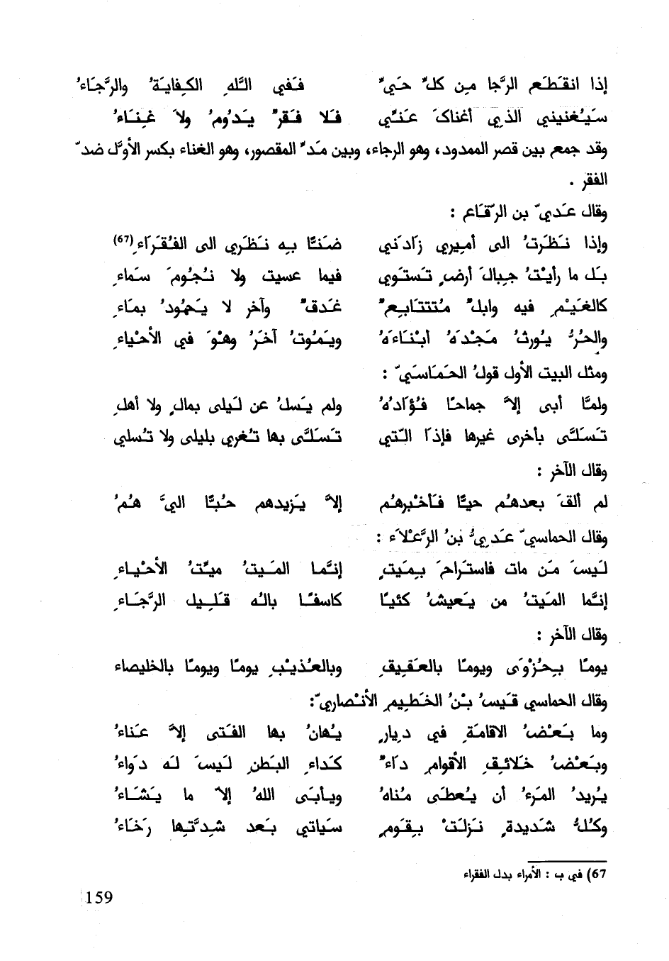 وقد جمع بين الممدوح وهو الرجاء وبين مد المقصور وهو الغناء بكسر الأول ضد الفقر.