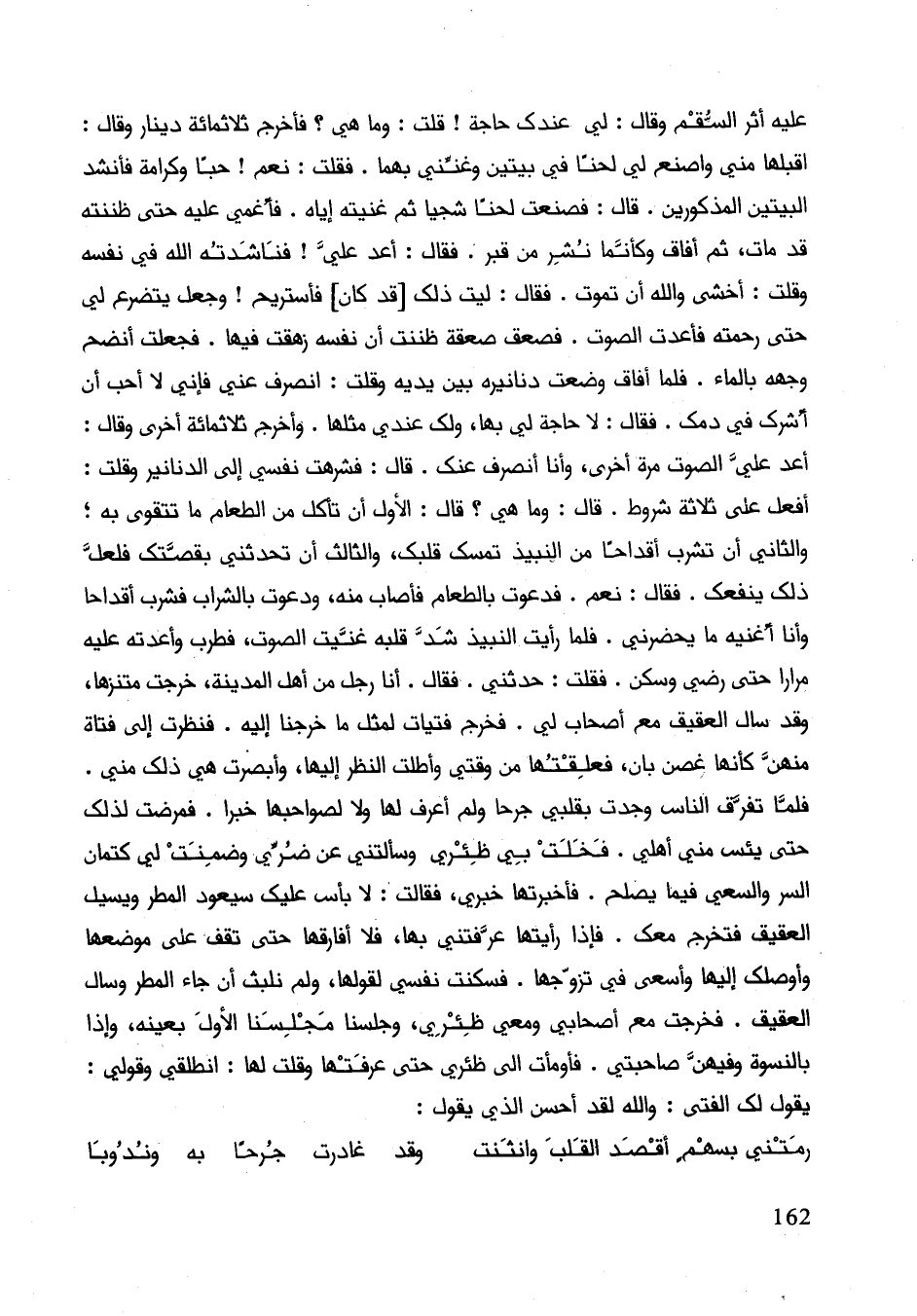 عليه اثر السقم وقال: لي عندك حاجة! قلت: وما هي؟ فأخرج ثلاثمائة دينار وقال: اقبلها مني واصنع لي لحنا في بيتين وغنني بها. فقلت: نعم! حبا وكرامة فأنشد البيتين المذكورين. قال: فصنعت لحنا شجيا ثم غنيته إياه. فأغمي عليه حتى ظننته قد مات ثم أفاق وكأنما نشر من قبر. فقال: أعد عليّ! فناشدته الله في نفسه وقلت: أخشى والله أن تموت. فقال: ليت ذلك قد كان فأستريح! وجعل يتضرع لي حتى رحمته فأعدت الصوت. فصعق صعقة ظننت أن نفسه زهقت فيها. فجعلت أنضح وجهه بالماء. فلما أفاق وضعت دنانيره بين يديه وقلت: انصرف عني فإني لا أحب أن أشرك في دمك. فقال: لا حاجة لي بها ولك عندي مثلها. وأخرج ثلاثمائة أخرى وقال: أعد علي الصوت مرة أخرى وأنا أنصرف عنك. فشرهت نفسي إلى الدنانير وقلت: أفعل على ثلاث شروط. قال: وما هي؟ قال: الأول أن تأكل من الطعام ما تتقوى به؛ والثاني أن تشرب أقداحا من النبيذ تمسك قلبك والثالث أن تحدثني بقصتك فلعل ذلك ينفعك. فقال: نعم. فدعوت بالطعام فأصاب منه ودعوت بالشراب فشرب أقداحا وأنا أغنيه ما يحضرني. فلما رأيت النبيذ شد قلبه غنيت الصوت فطرب وأعته عليه مرارا رضي وسكن. فقلت: حدثني. فقال. أنا رجل من أهل المدينة خرجت متنزها وقد سال العقيق مع أصحاب لي. فخرج فتيات لمثل ما خرجنا إليه. فنظرت إلى فتاة منهن كأنها غصن بان، فعلقتها من وقتي وأطلت إليها وأبصرت هي ذلك مني. فلما تفرق الناس وجدت بقلبي جرحا ولم أعرف لها ولا لصواحبها خبرا. فمرضت لذلك حتى يئس مني أهلي. فخلت بي ظئري وسألتني عن ضري وضمنت لي كتمان السر والسعي فيما يصلح. فأخبرتها خبري، فقالت: لا بأس عليك سيعود المطر ويسيل العقيق فتخرج معك. فإذا رأيتها عرفتني بها فلا أفارقها حتى تقف على موضعها وأوصلك إليها وأسعى في تزوجها. فسكنت نفسي لقولها ولم نلبث أن جاء المطر وسال العقيق. فخرجت مع أصحابي ومعي ظئري وجلسنا مجلسنا الأول بعينه وإذا بالنسوة وفيهن صاحبتي. فأومأت إلى ظئري حتى عرفتها وقلت لها: انطلقي وقولي: يقول لك الفتى: والله لقد أحسن الذي يقول: