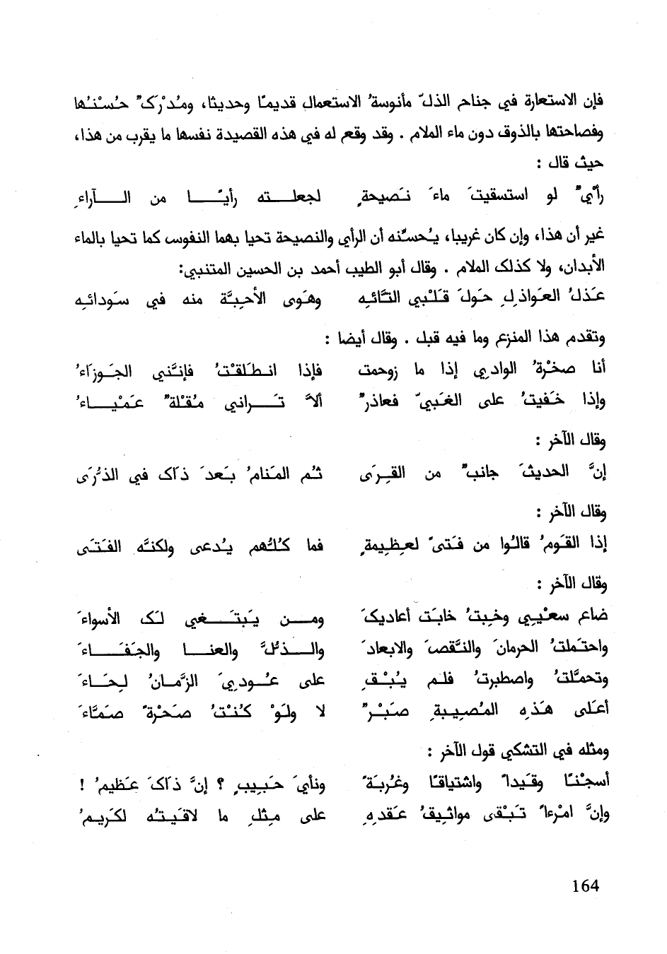 فإن الاستعارة في جناح الذل مأنوسة الاستعمال قديما وحديثا، ومدركا حسنها وفصاحتها بالذوق دون ماء الملام. وقد وقع له في هذه القصيدة نفسها ما يقرب من هذا، حيث قال: