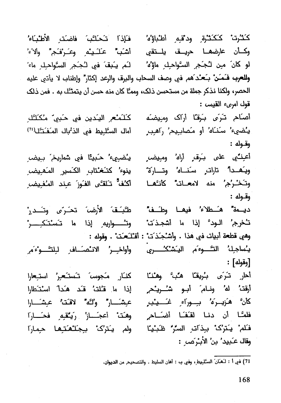 وللعرب فمن بعدهم في وصف السحاب والبرق والرعد إكثار وإطناب لا يأتي عليه الحصر ولكنا نذكر جملة من مستحسن ذلك ومما كان منه حسن إنَّ يتمثل به. فمن ذلك قول امرئ القيس: