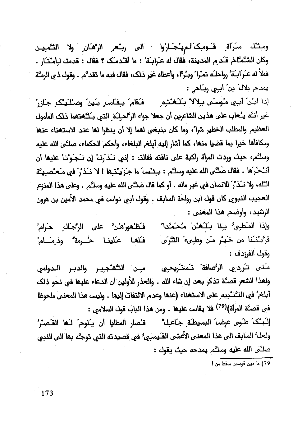 غي إنّه يعاب على هذين الشاعرين أن جعلا جزاء الراحلة التي بلغتهما ذلك المأمول العظيم والمطلب الخطير شرا، وما كان ينبغي لهما أن ينظرا لها عند الاستغناء عنها ويكافئها خيرا بما قضيا منها كما أشار إليه أبلغ البلغاء وأحكم الحكماء صلى الله عليه وسلم حيث وردت المرأة راكبة على ناقته فقالت: إني نذرت إن نجوت عليها أن أنحرها. فقال صلى الله عليه وسلم: بئس ما جزيتها! لا نذر في معصية الله ولا نذر للإنسان في غير ماله. أو كما قال صلى الله عليه وسلم وعلى هذا المنزع العجيب النبوي كان قول أبن رواحة السابق. وقول أبي نواس في محمد الأمين بن هارون الرشيد، وأوضح هذا المعنى:
