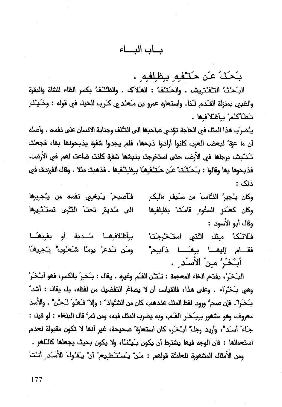 البحث: التفتيش. والحتف: الهلاك. والظلف بكسر الظاء للشاة والبقرة والظبي بمنزلة القدم لنا. واستعاره عمرو بن معدي كرب للخيل في قوله: وخيلٍ تطأكم بأظلافها.