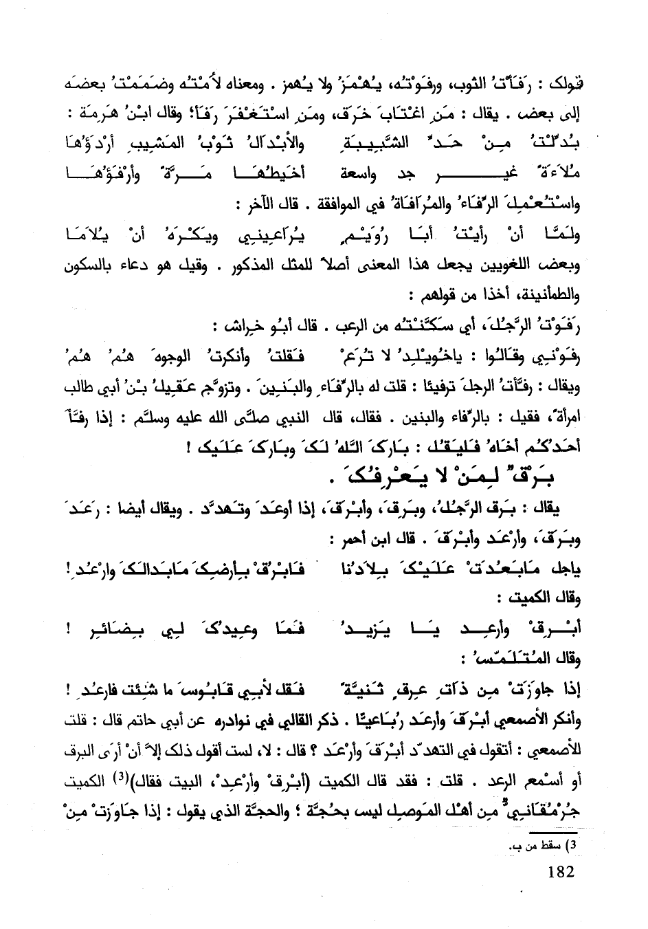 يقال: برق الرجل وبرق وأبرق إذا أوعد وتهدد. ويقال أيضاً: رعد وبرق وأرعد وأبرق. قال أبن أحمر: