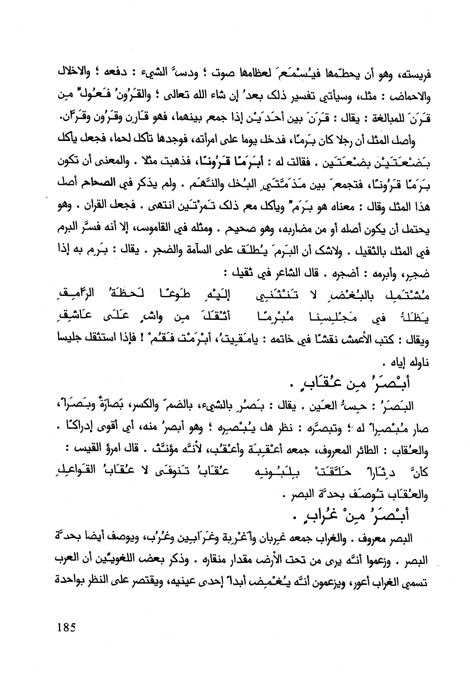 البصر: حس العين. يقال: بصر بالشيء، بالضم والكسر بصارة وبصرا، صار مبصرا له؛ وتبصره: نظر هل يبصره؛ وهو أبصر منه، أي أقوى إدراكا. والعقاب: الطائر المعروف، جمعه أعقب، لأنه مؤنث. قال امرؤ القيس: