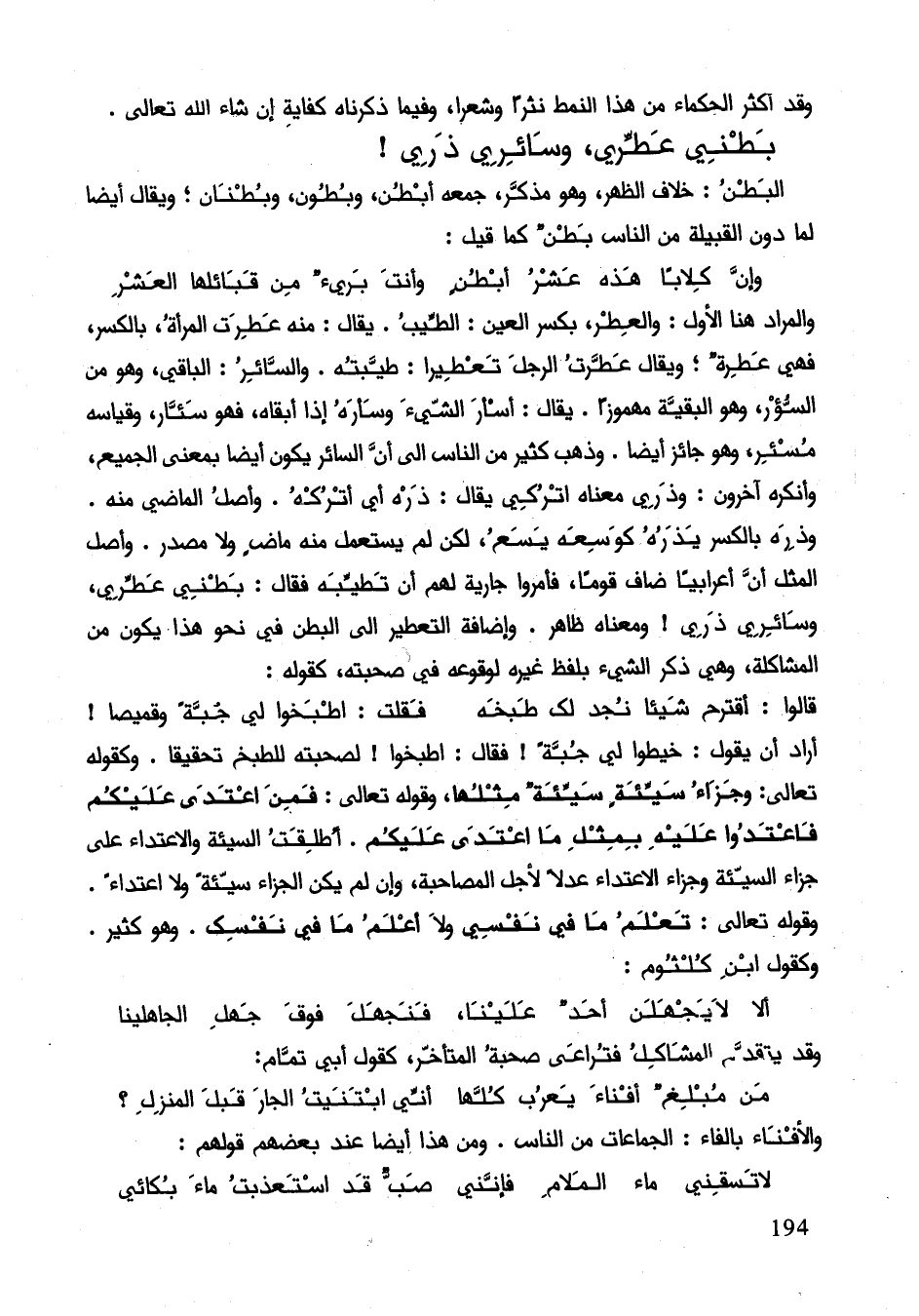 والمراد هنا الأول: والعطر، بكسر العين: الطيب. ويقال: منه عطرت المرأة، بالكسر، فهي عطرة؛ ويقال عطرت الرجل تعطيرا: طيبته والسائر: الباقي، وهو من السؤر، وهو البقية مهموز. يقال: أسأر الشيء وسأره إذا أبقاه، فهو سئار، وقياسه مسئر، وهو جائز أيضاً. وذهب كثير من الناس إلى أنَّ السائر يكون أيضاً بمعنى الجميع، وأنكره آخرون: وذري معناه اتركي يقال: ذره أي أتركه. وأصل الماضي منه. وذره بالكسر يذره كوسعه يسع، لكن لم يستعمل منه ماضٍ ولا مصدر. وأصل المثل أنَّ أعرابياً ضاف قوما، فأمروه جارية لهم أن تطيبه فقال: بطني عطري، وسائري ذري! ومعناه ظاهر. وإضافة التعطير إلى البطن في نحو هذا يكون من المشاكلة، وهي ذكر الشيء بلفظ غيره لوقوعه في صحبته، كقوله: