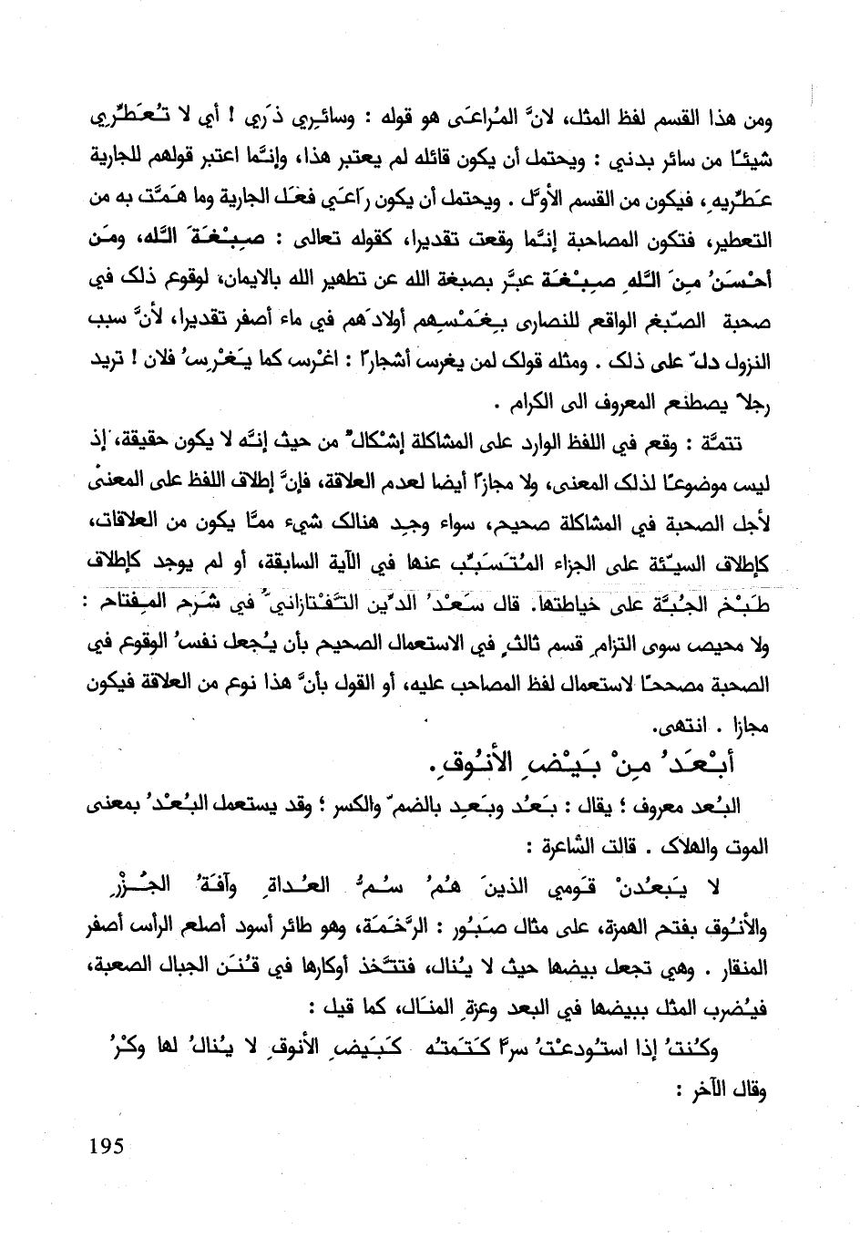 ومن هذا القسم لفظ المثل، لأن المراعي هو قوله: وسائري ذري! أي لا تعطري شيئاً من سائر بدني: ويحتمل إنَّ يكون قائله لم يعتبر هذا، وإنّما اعتبر قولهم للجارية عطريه، فيكون من القسم الأول. ويحتمل أنَّ يكون راعي فعل الجارية وما همت به من التعطير، فتكون المصاحبة إنّما وقعت تقديراً، كقوله تعالى:) صبغة الله، ومن أحسن من الله صبغة (عبر الله عن تطهير الله بالإيمان، لوقوع ذلك في صحبة الصبغ الواقع للنصارى بغمسهم أولادهم في ماء اصفر تقديراً، لأن سبب النزول دل على ذلك. ومثله لمن يغرس أشجاراً: غرس كما يغرس فلان! تريد رجلاً يصطنع المعروف إلى الكرام.