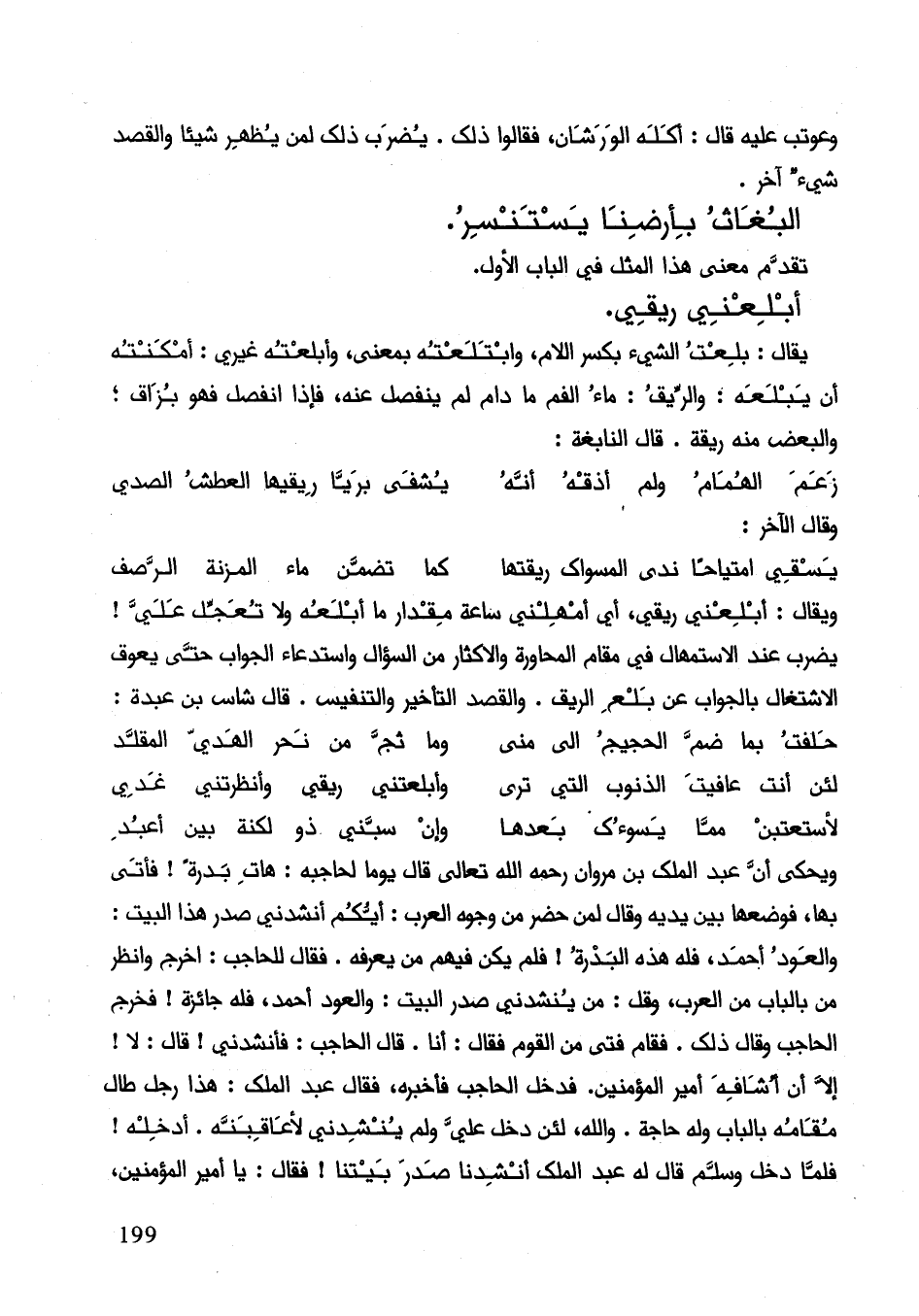 ويحكى أنَّ عبد الملك بن مروان رحمه الله تعالى قال يوما لحاجبه: هات بدرة! فأتى بها، فوضعها بين يديه وقال لمن حضر من وجوه العرب: أيكم أنشدني صدر هذا البيت: والعود أحمد، فله هذه البدرة! فلم يكن فيهم من يعرفه. فقال للحاجب: اخرج وانظر من بالباب من العرب، وقل: من ينشدني صدر البيت: والعود أحمد، فله جائزة! فخرج الحاجب وقال ذلك. فقام فتى من القوم فقال: أنا. قال الحاجب: فأنشدني! قال: لا! إلاّ أن أشافه أمير المؤمنين. فدخل الحاجب فأخبره فقال عبد الملك: هذا رجل طال مقامه بالباب وله حاجة. والله لئن دخل عليَّ ولم ينشدني لأعاقبنه. أدخله! فلما دخل وسلم قال له عبد الملك أنشدنا صدر بيتنا! فقال: يا أمير المؤمنين،